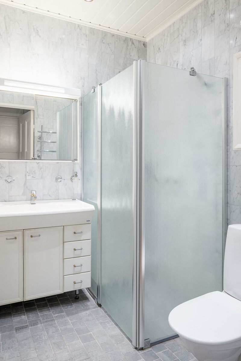 Kylpyhuoneessa laattalattia ja seinät marmoria, lattialämmitys. Wc-istuin, pyyhekuivain, allaskaapisto, peilikaappi, suihku. |