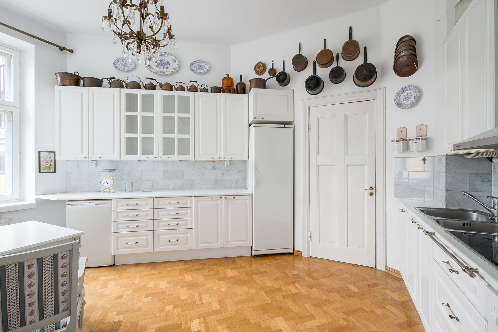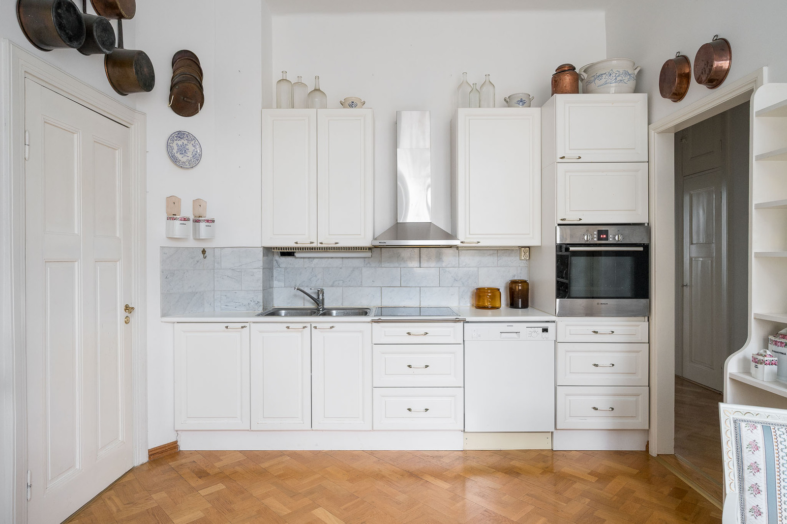 Erillinen tilava keittiö sisäpihan puolelle. Keittiössä on huoneiston toinen sisäänkäynti, josta kulku B-portaaseen ja vinttiin. Keittiössä on valkoiset kaapistot ja työtasot. Varustus: Jääkaappi, pakastin, kalusteuuni, astianpesukone, keraaminen liesi, liesituuletin. |