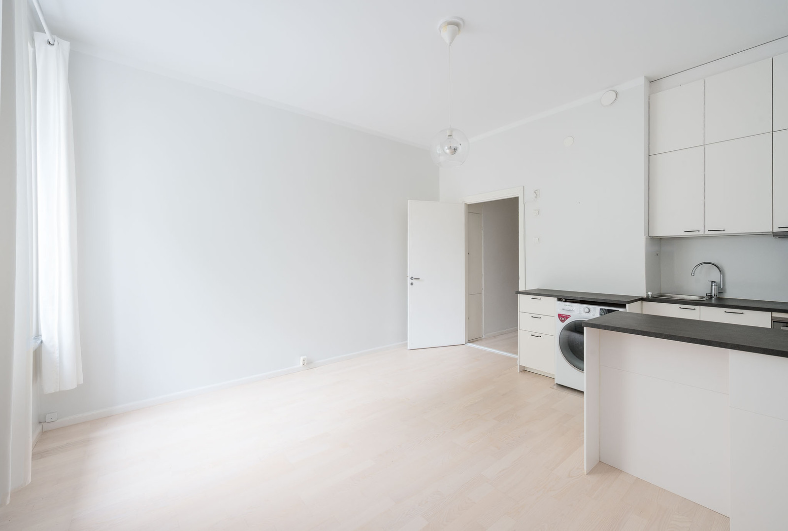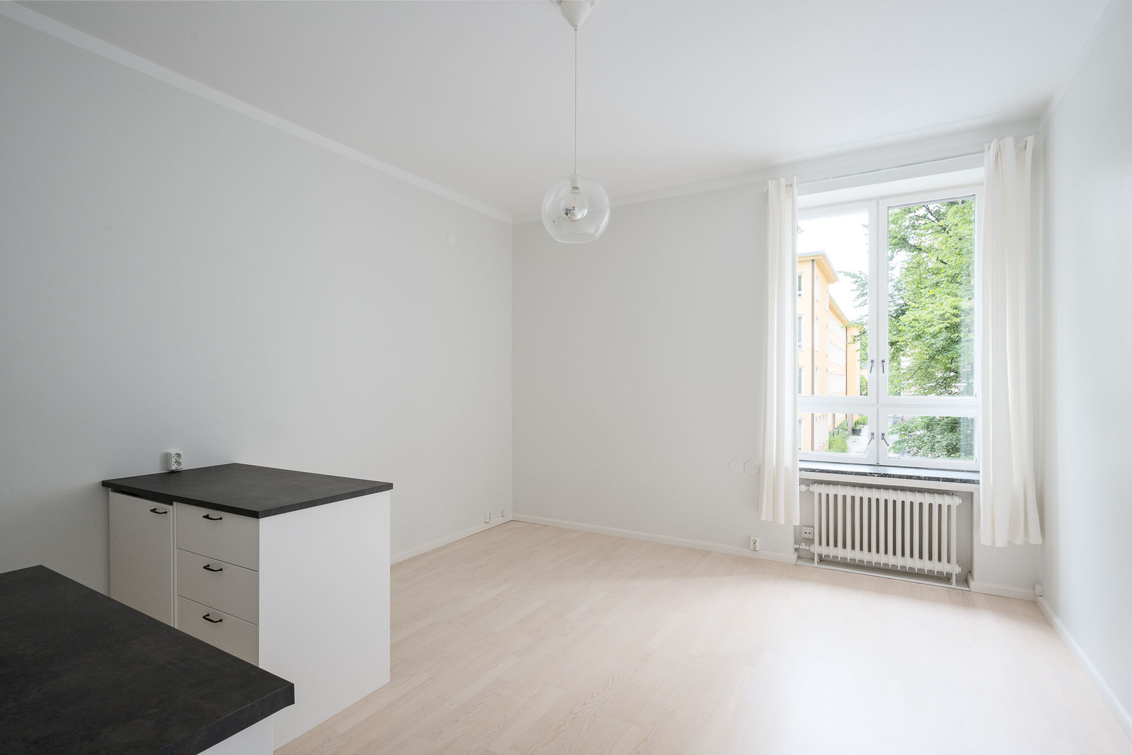 Huoneistossa on siistikuntoinen laminaattilattia ja seinät maalattu. Ikkunasta aukeaa vehreä näkymä Lönnrotinkadun yli. |