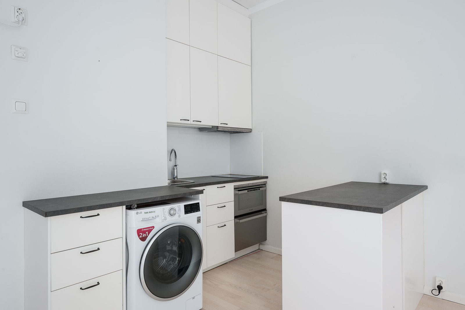 Keittosyvennys, jossa runsaasti kaappitilaa. Saareke tuo keittiöön lisää kaivattua laskutilaa. Valkoiset kaapistot, mustat työtasot. Keittiössä keraaminen liesitaso, uuni, astainpesukone. Kuivaava pyykinpesukone on sijoitettu keittiöön. |