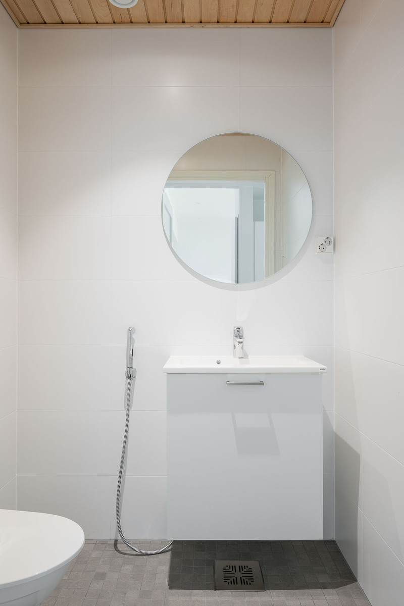 Kylpyhuoneessa wc-istuin, allaskaappi, peilikaappi, suihku ja suihkuseinä. Seinät kaakelia lattia laattaa sähkötoimisella mukavuuslattialämmityksellä.