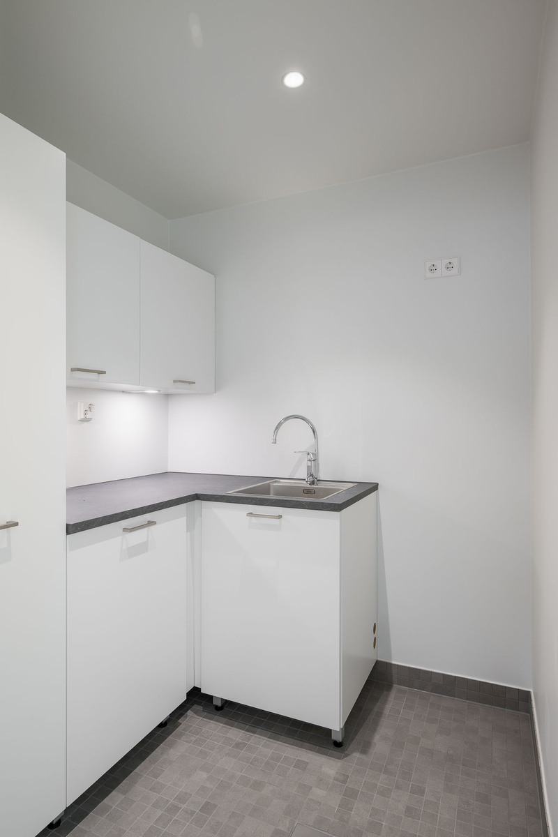 Kodinhoitohuoneessa pesukoneliitäntä, pesuallas sekä hyvin kaappitilaa.