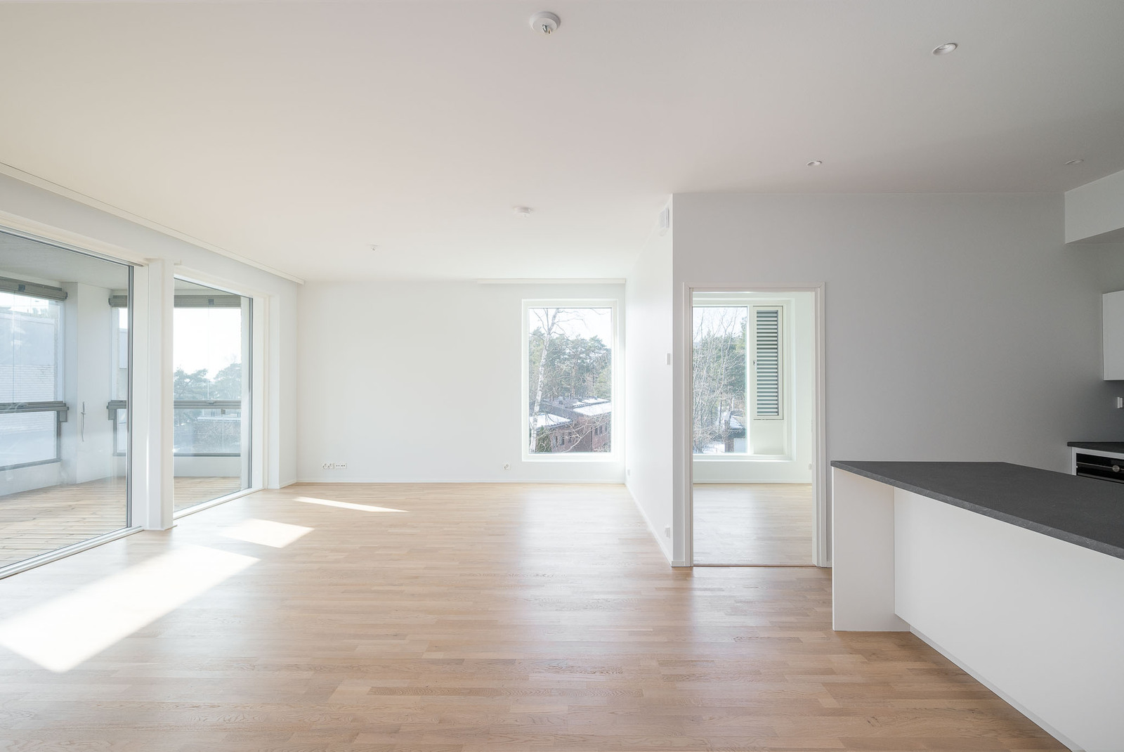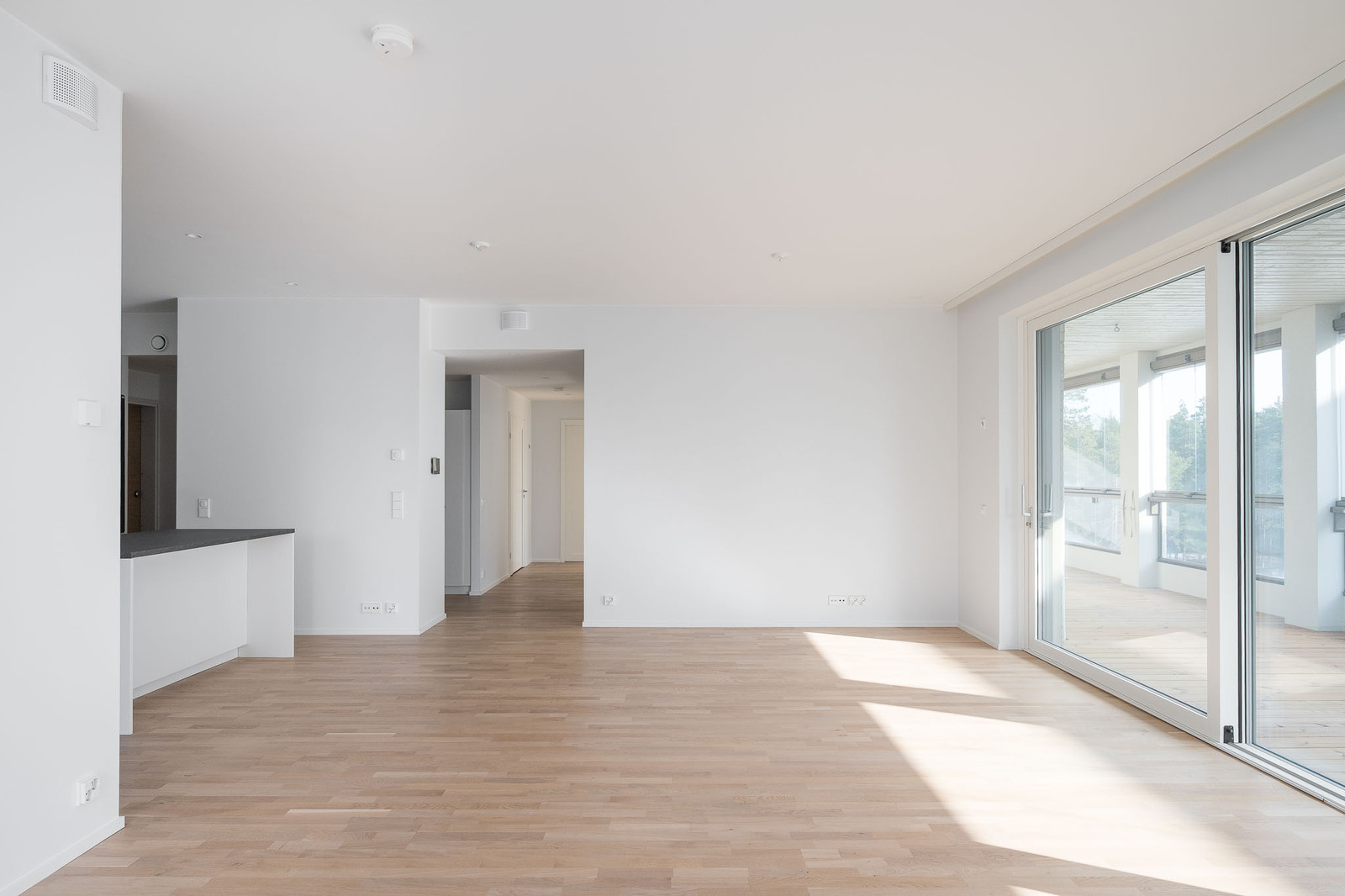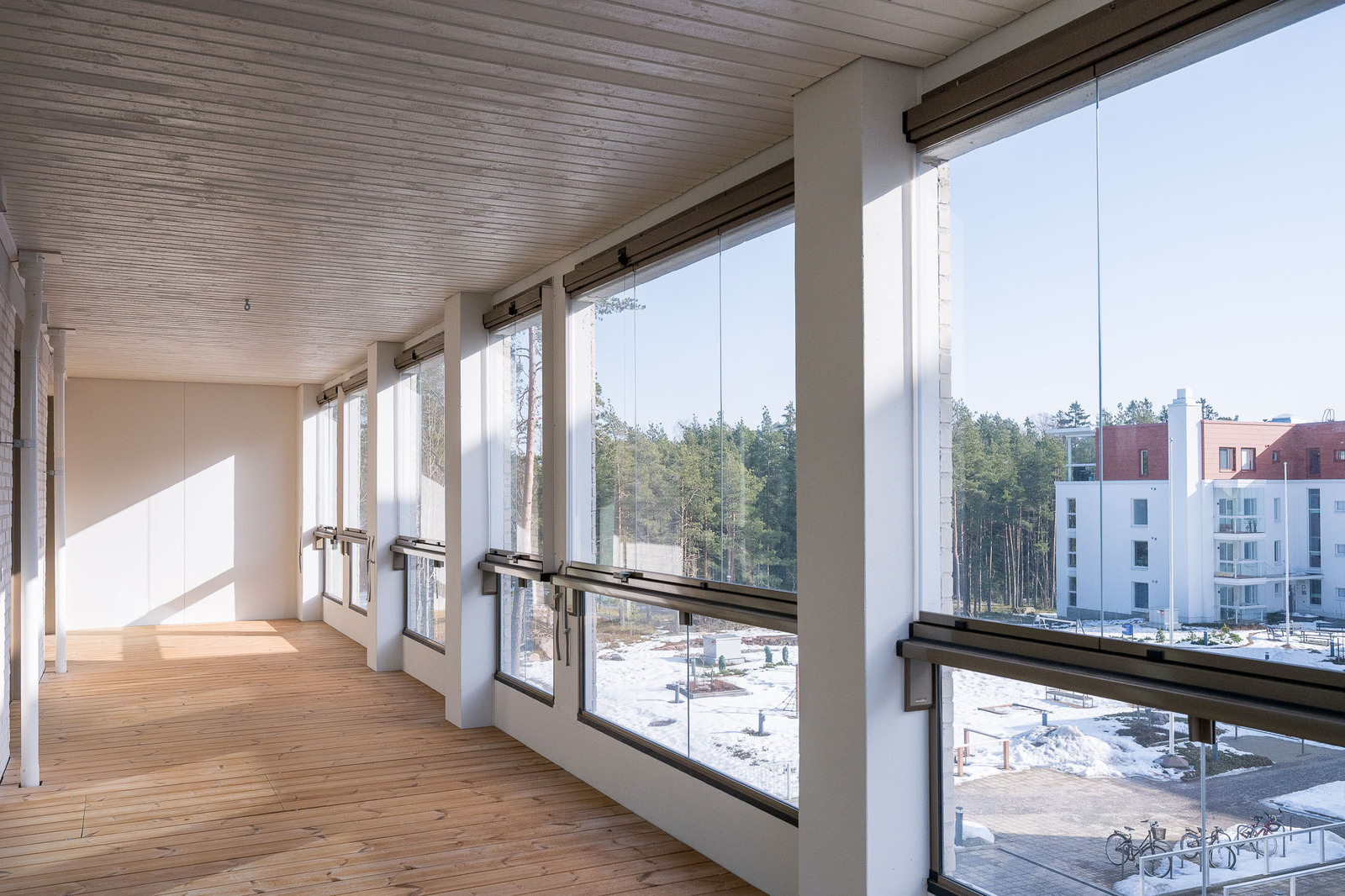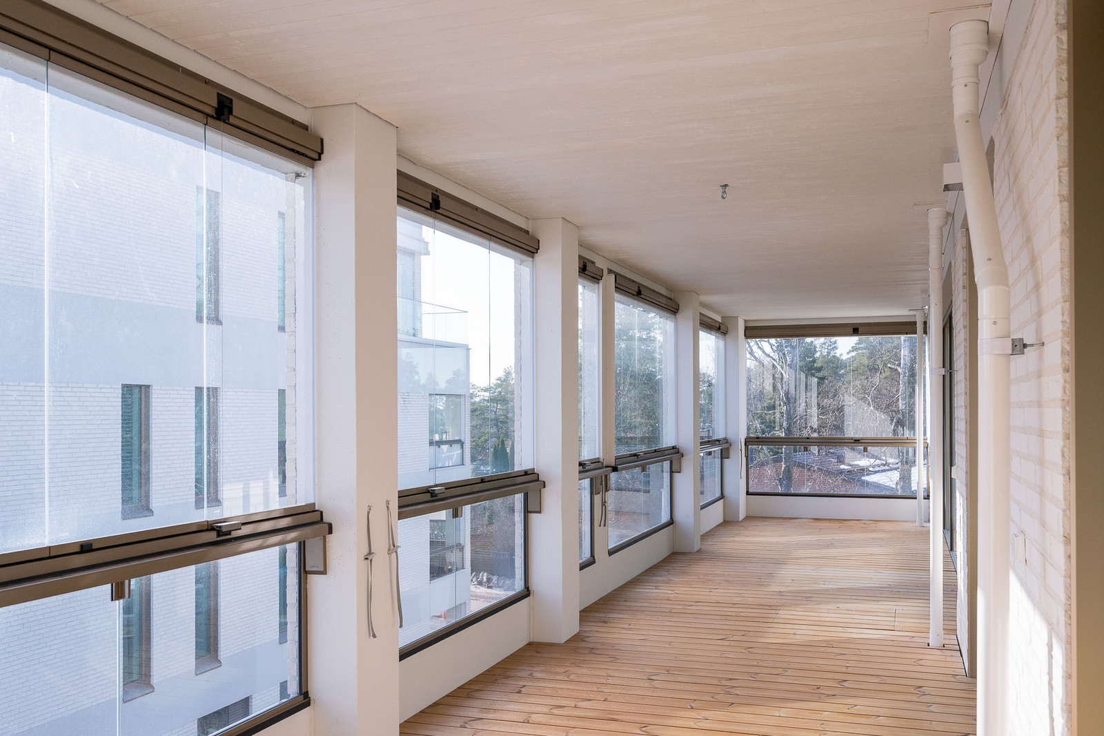 Huoneistossa on kauniit vaaleat materiaalit, oma sauna ja koko huoneiston levyinen lasitettu 35m2 parveke etelään.