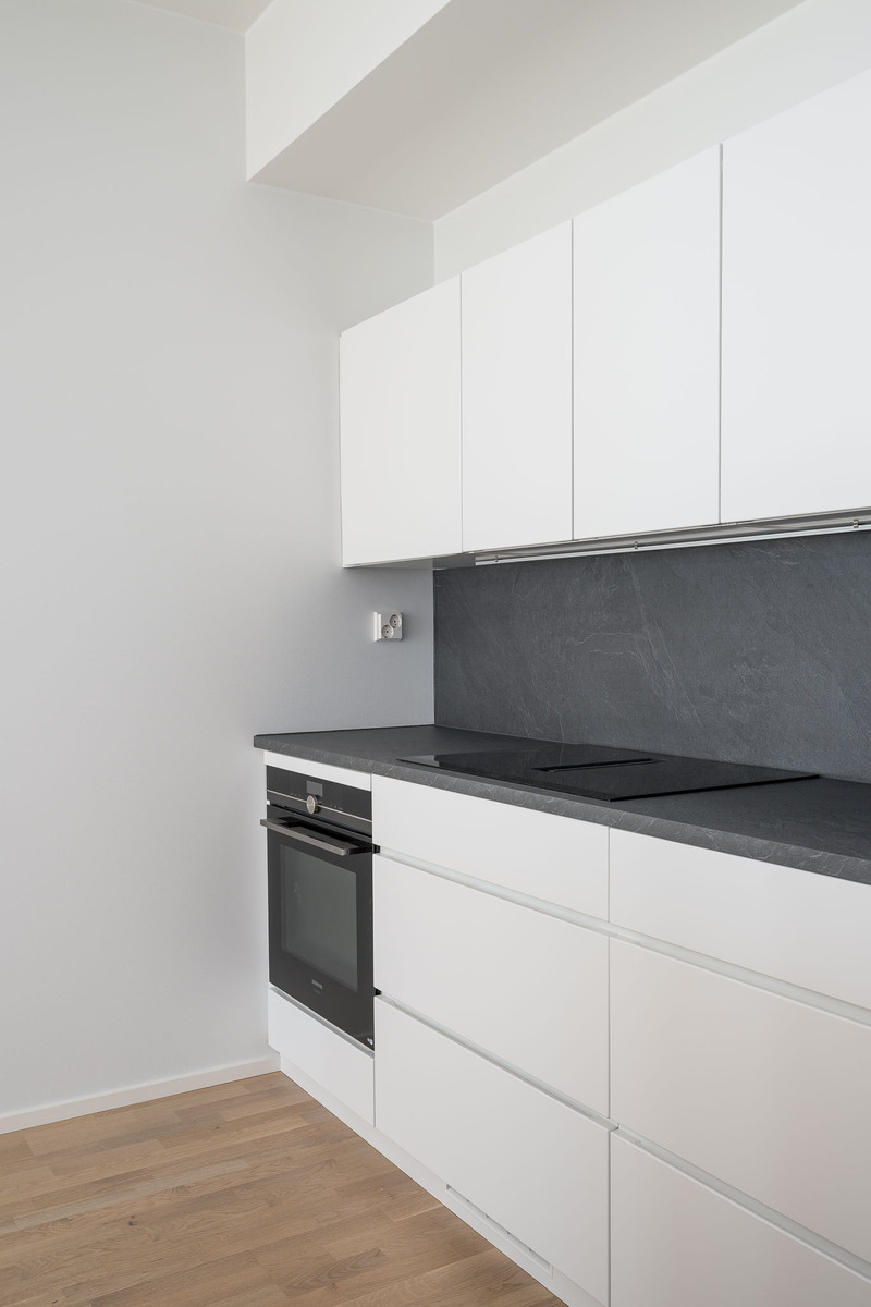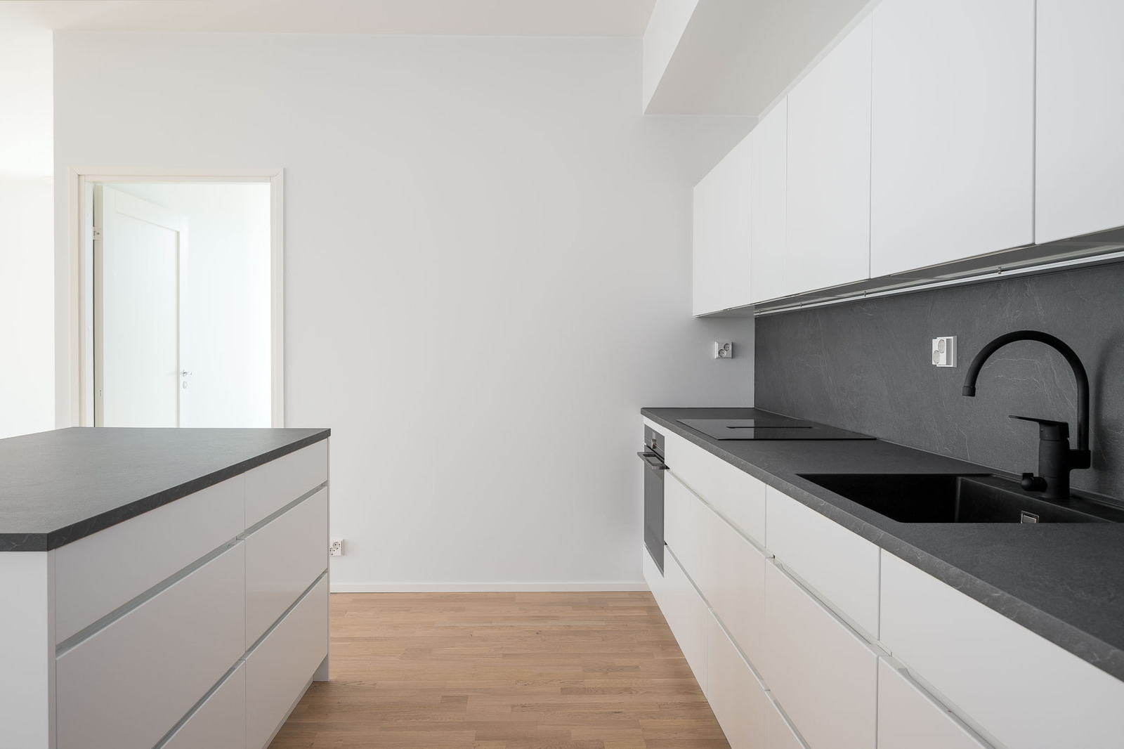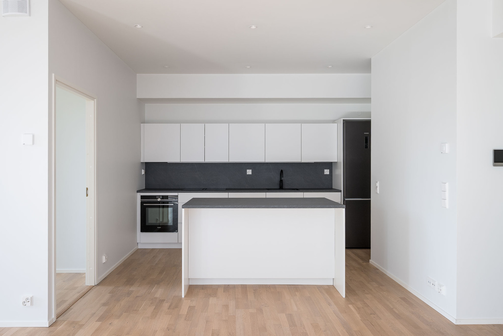 Valkoinen hyvin varusteltu KVIKin avokeittiö, jossa saarreke. Siemensin kodinkoneet. Keittiössä on erillisuuni mikroaaltotoiminnolla, induktioliesitaso integroidulla liesituulettimella, jääkaappi/pakastin ja integroitu astianpesukone.