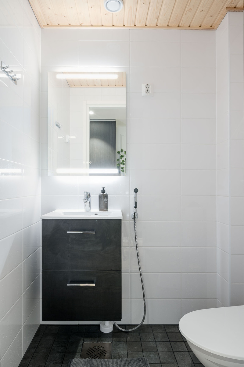 Tilava wc, jossa varusteina allaskaappi, peili ja bidésuihku. Mukavuuslämmitys. |
