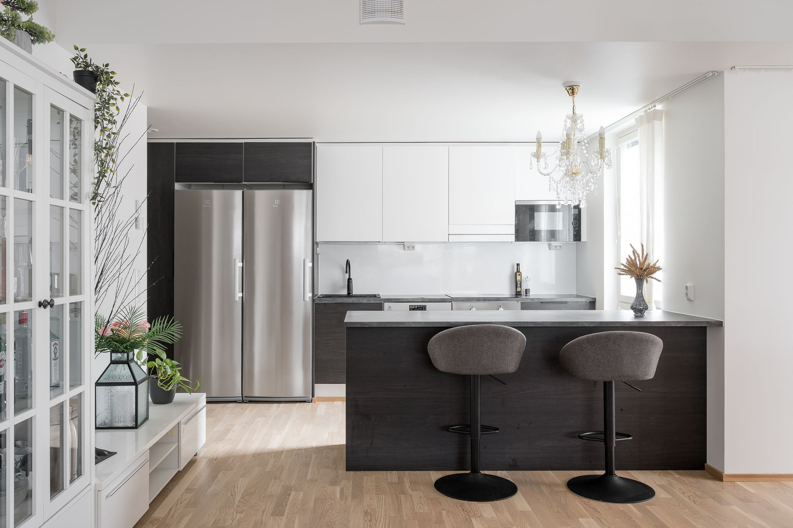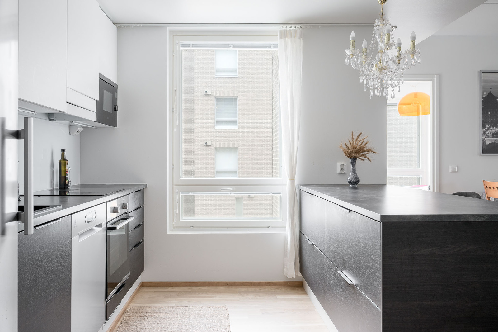 Tummasävyinen keittiö niemekkeellä. Varusteina täyskorkeat jääkaapi ja pakastin, erillisuuni, induktioliesi, integroitu mikroaaltouuni, astianpesukone. |