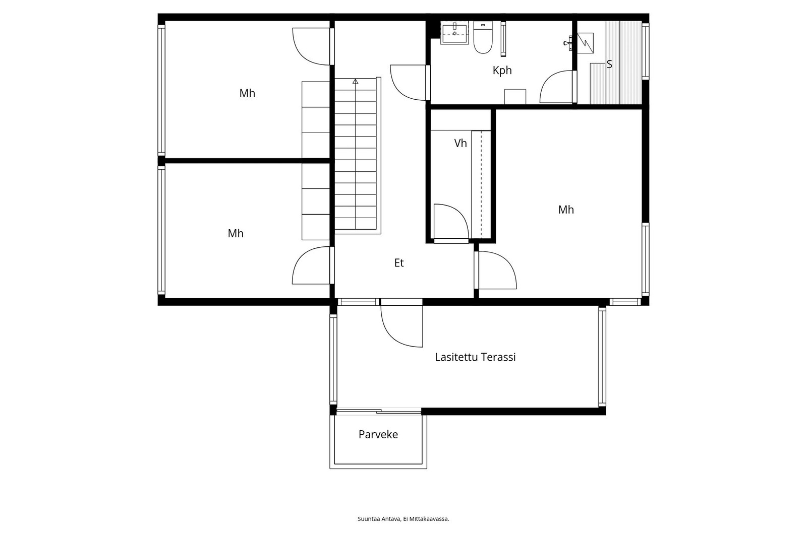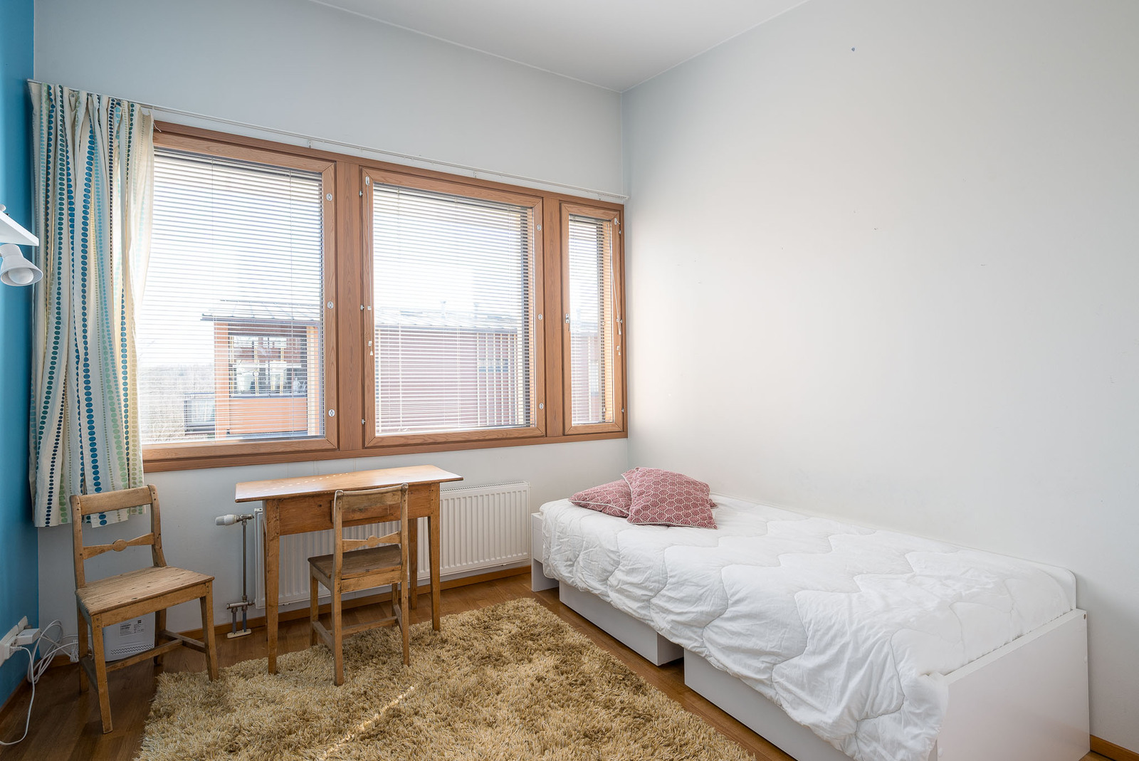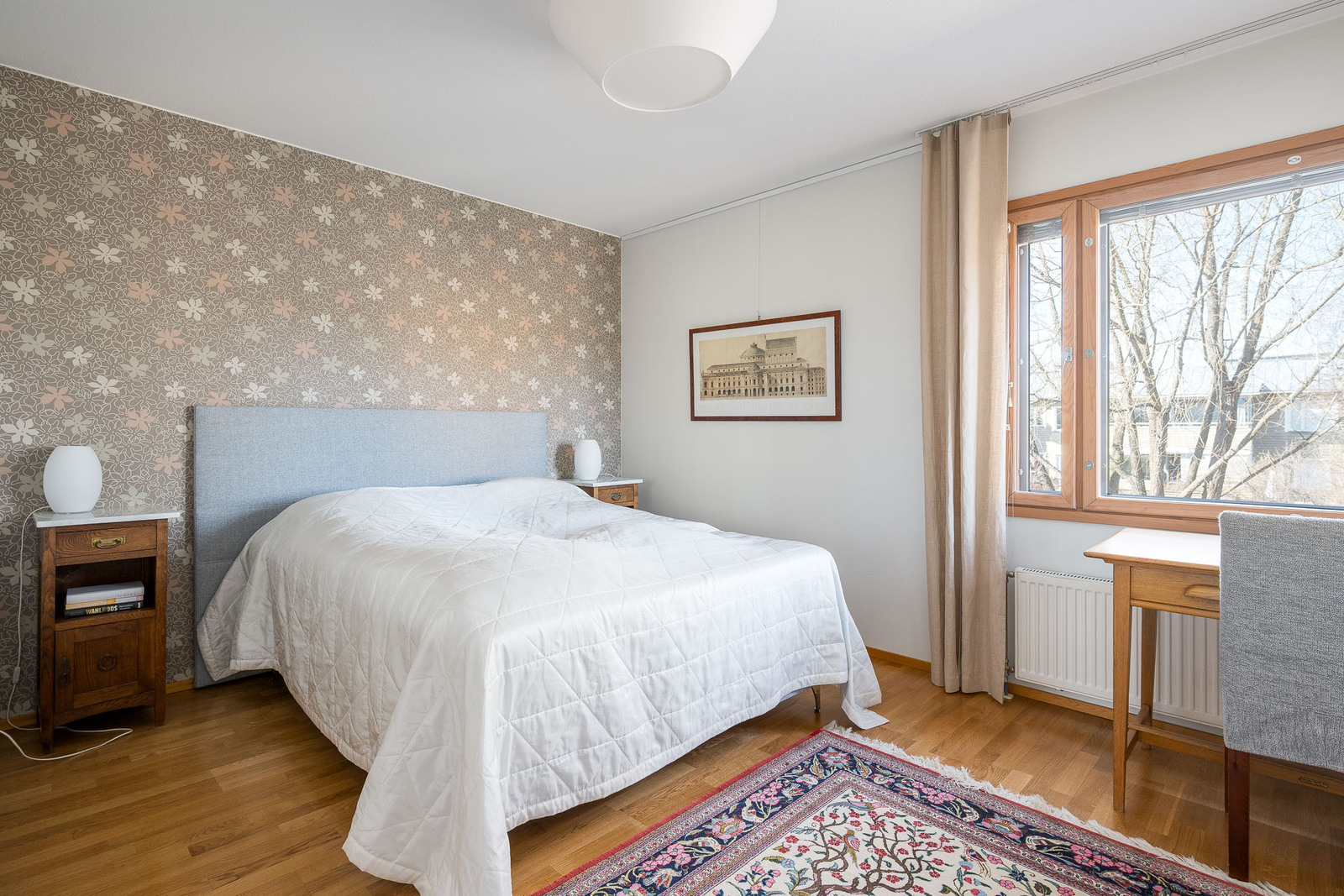 Kolme makuuhuonetta yläkerrassa. Kahdessa huoneessa kiinteät kaapistot. Yläkerrassa on myös tilava vaatehuone sekä suuri katettu ja lasitettu terassiparveke.