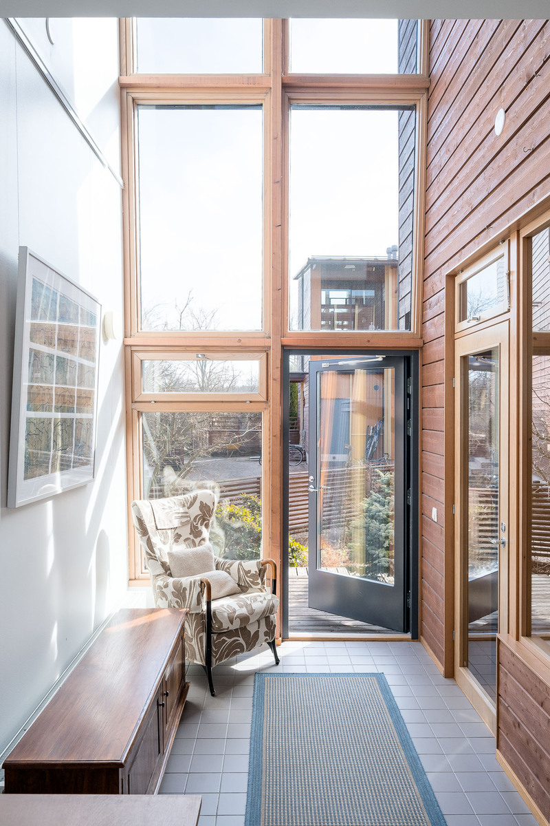 Sisäänkäynnin yhteydessä viherhuone, jossa kahden kerroksen korkeudelta ikkunaa. Lattia on laatoitettu.