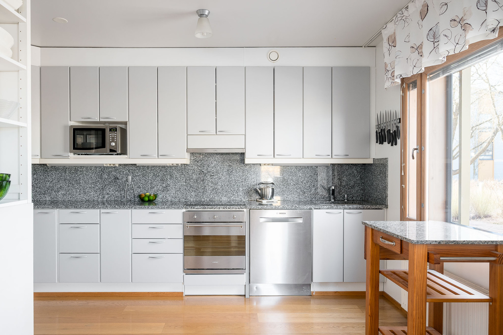 Tilavassa keittiössä on harmaat kaapistot ja kivitasot. AEG täyskorkeat jääkaappi ja pakastinkaappi on uutittu 2022 samoin kun SMEGin induktiotaso. Astianpesukone on uusittu 2019. Keittiö avautuu tilavaan ruokailuhuoneeseen.