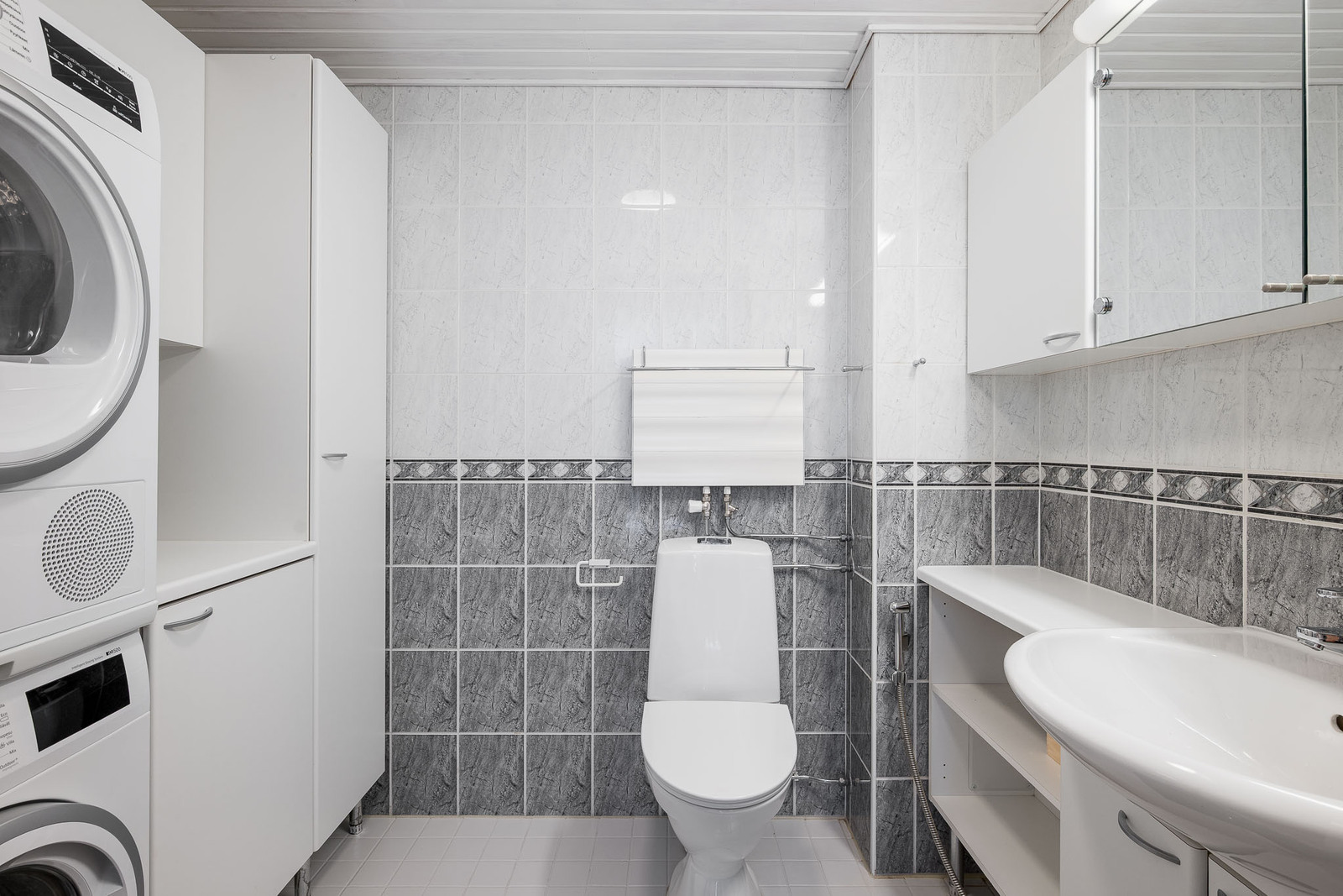 Alakerran wc:ssä on varustuksena allaskaapisto, peilikaappi, bidee, wc-istuin. Tilaa pesutornille (Siemens 11/2017) sekä kaapistot pyykkihuollolle. Lattia on laatoitettu ja seinät kaakeloitu.
