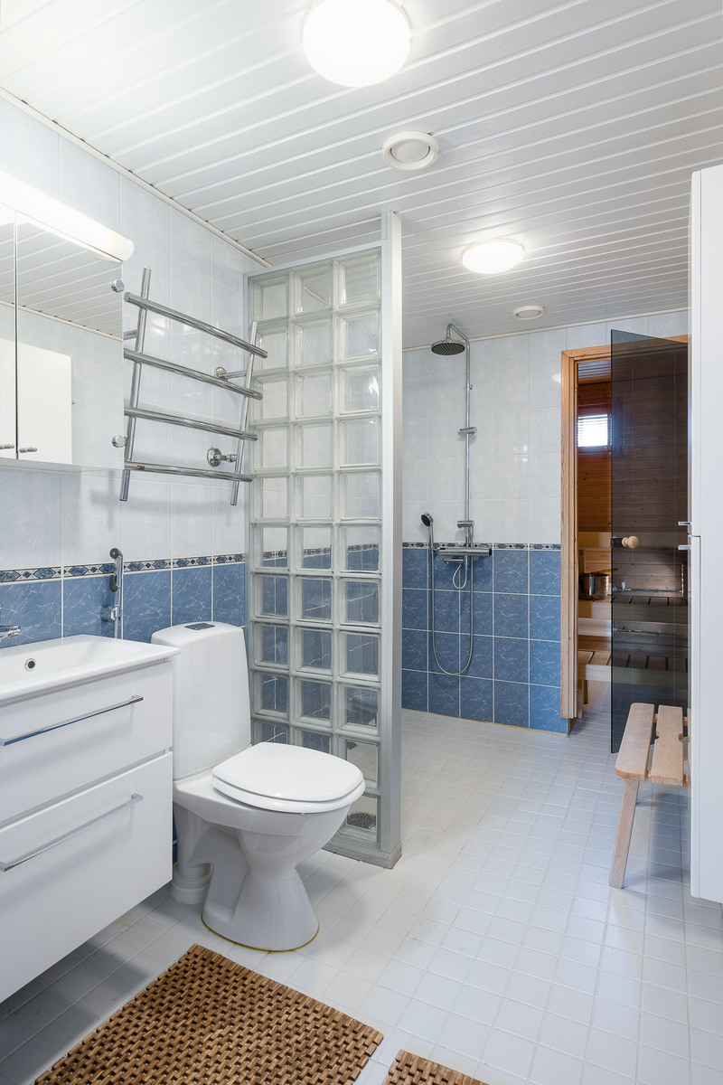 Yläkerrassa tilava kylpyhuone, jossa on allaskaapisto, peilikaappi, bidee, wc-istuin, pyyhekuivain, lasitiilinen suihkuseinä ja sadesuihku. Lattia on laatoitettu ja seinät kaakeloitu, lattialämmitys.
