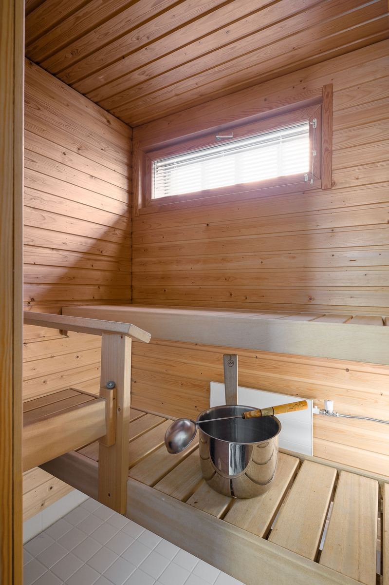 Oma saunaIkkunallisessa saunassa on Harvian sähkökiuas.