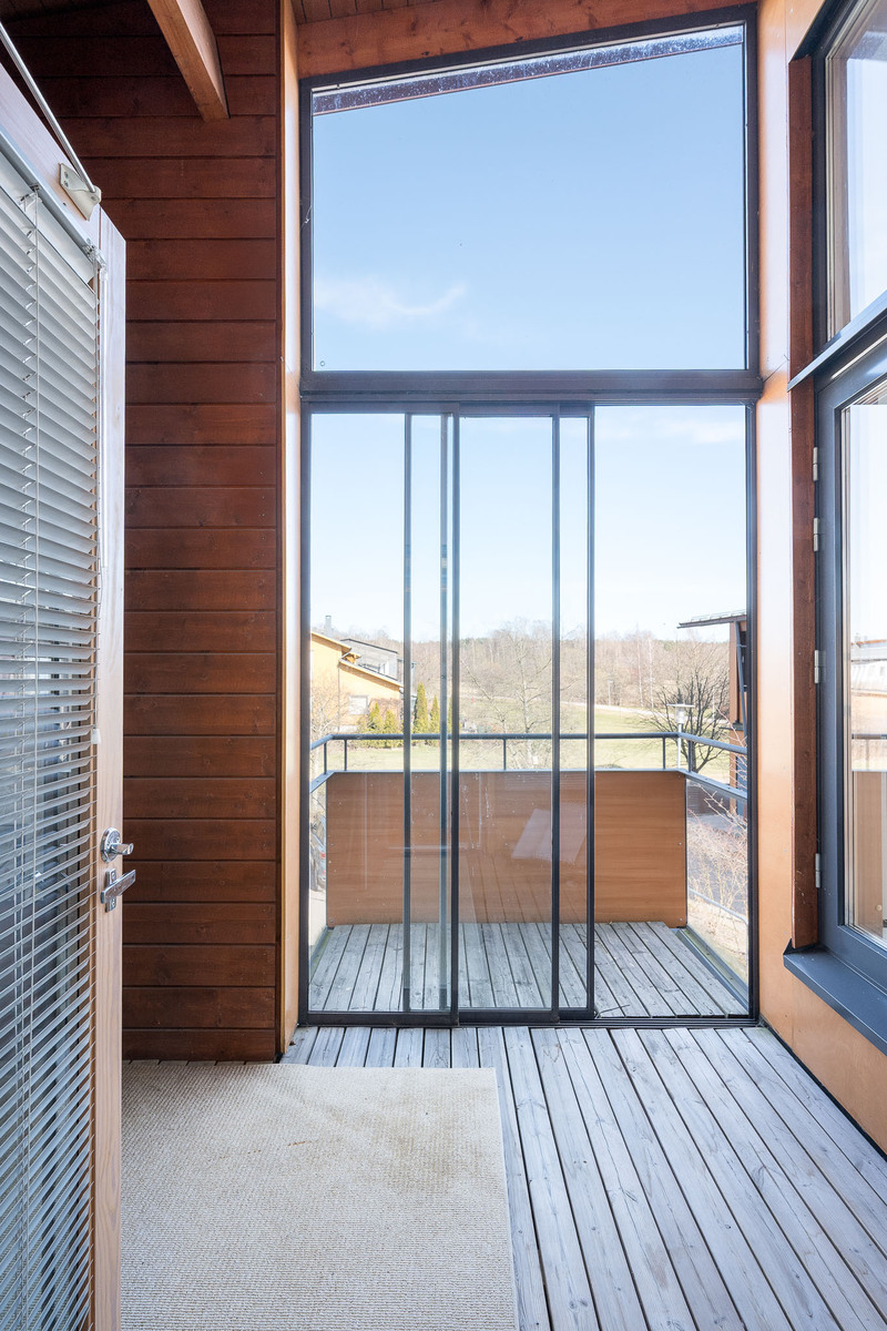 Yläkerrassa sijaitsee kolme reilukokoista makuuhuonetta, saunaosasto sekä iso lasitettu parveke, joka on kuin yksi huone lisää oleskeluun. Yläkerrasta löytyy myös toinen pienempi parveke.