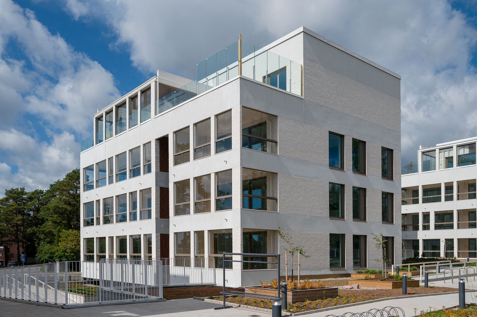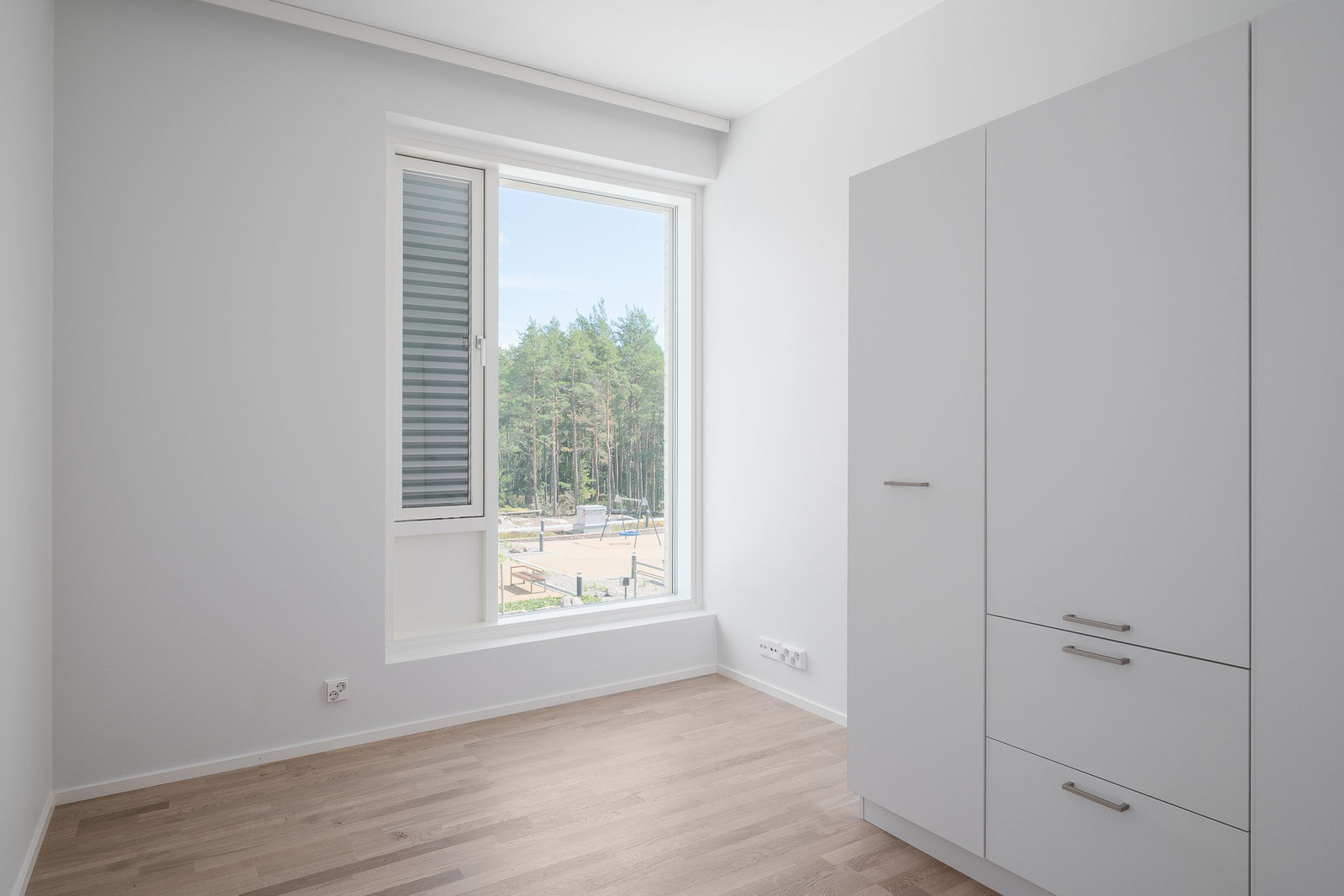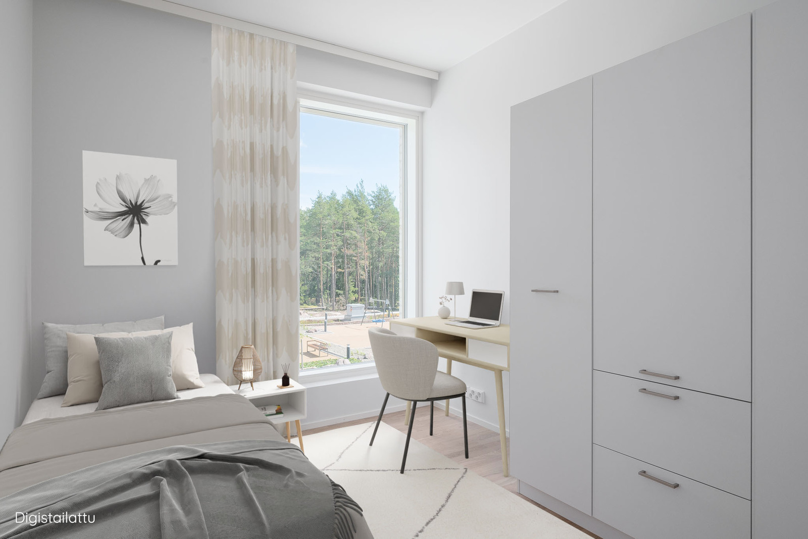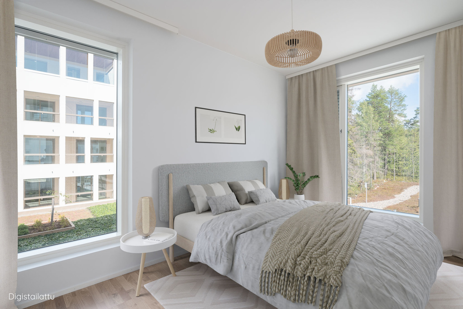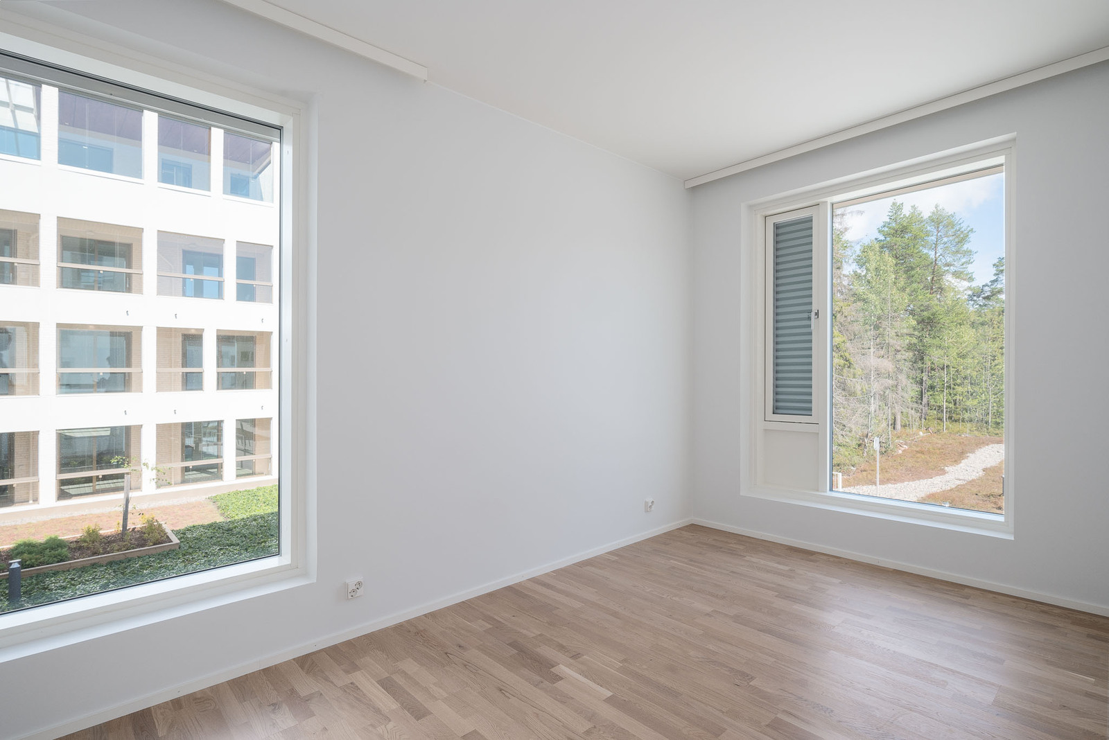 Huoneistossa on vaaleat modernit materiaalit ja valkomattalakattu tammilattia. Toisessa makuuhuoneessa on ikkunallinen vaatehuone. Tilavan kylpyhuoneen lisäksi on erillinen wc.