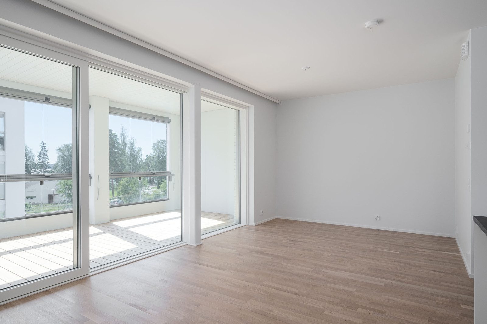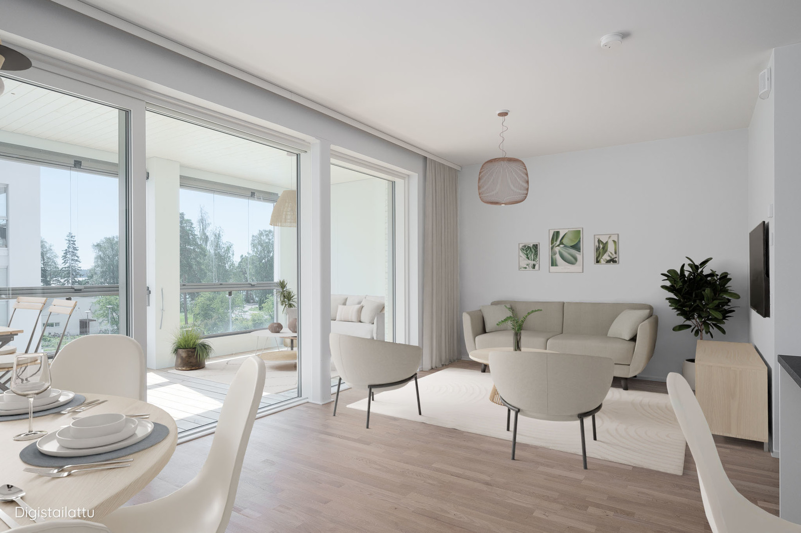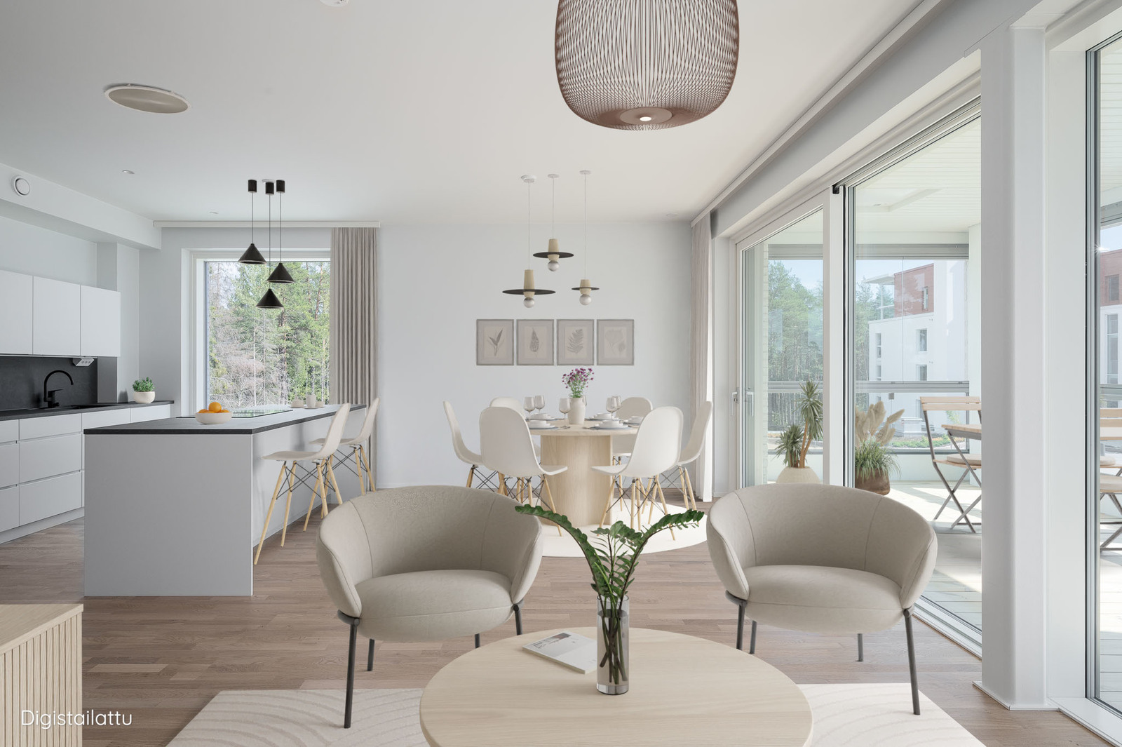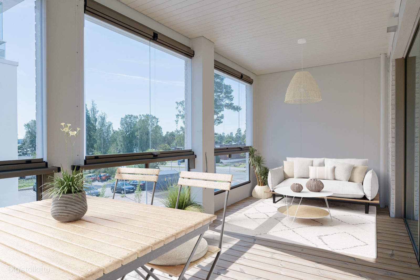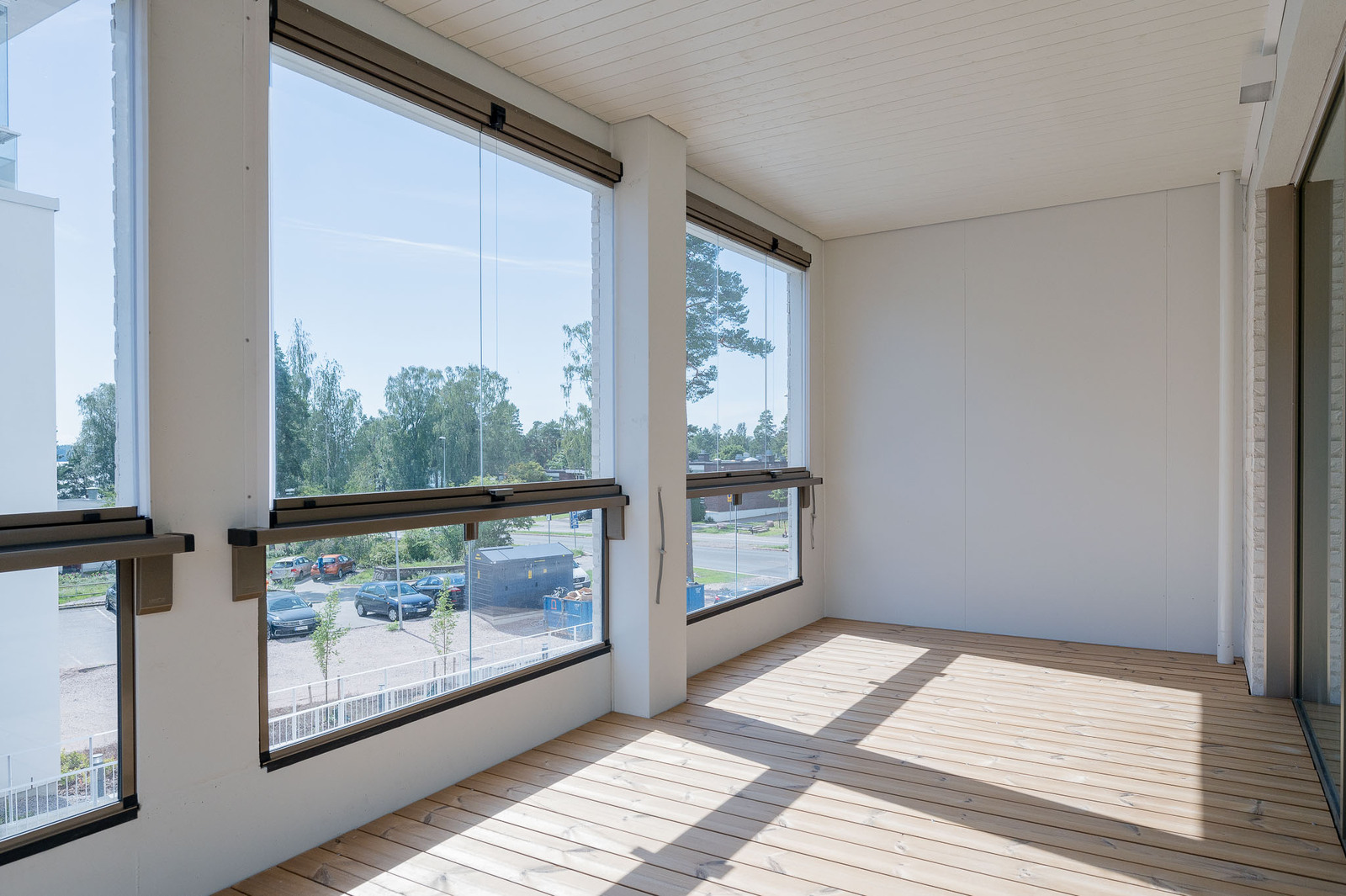 Olohuone, ruokailutila ja vaalea hyvin varusteltu avokeittiö ovat yhtä avaraa valoisaa tilaa. Olohuoneesta on käynti lasitetulle 17,5 m2 parvekkeelle, joka on kuin yksi huone lisää oleskeluun.