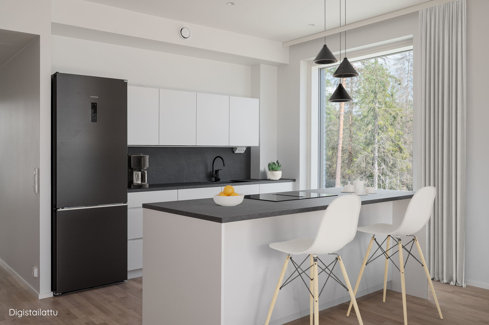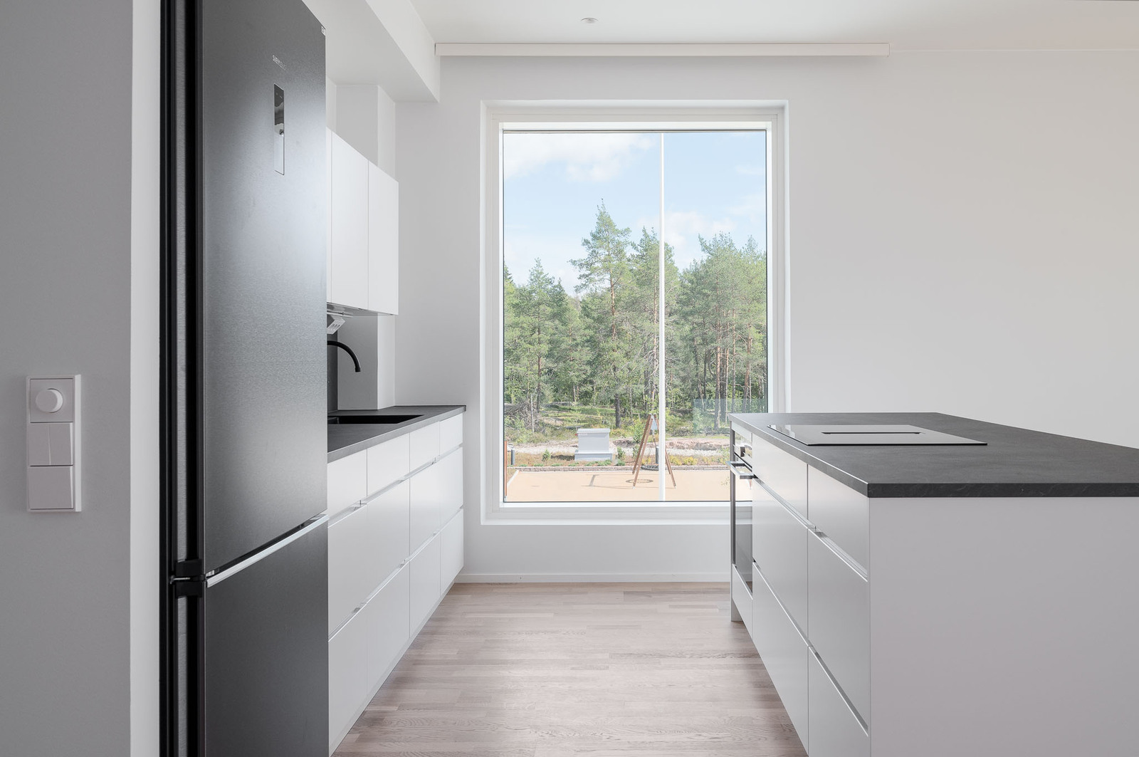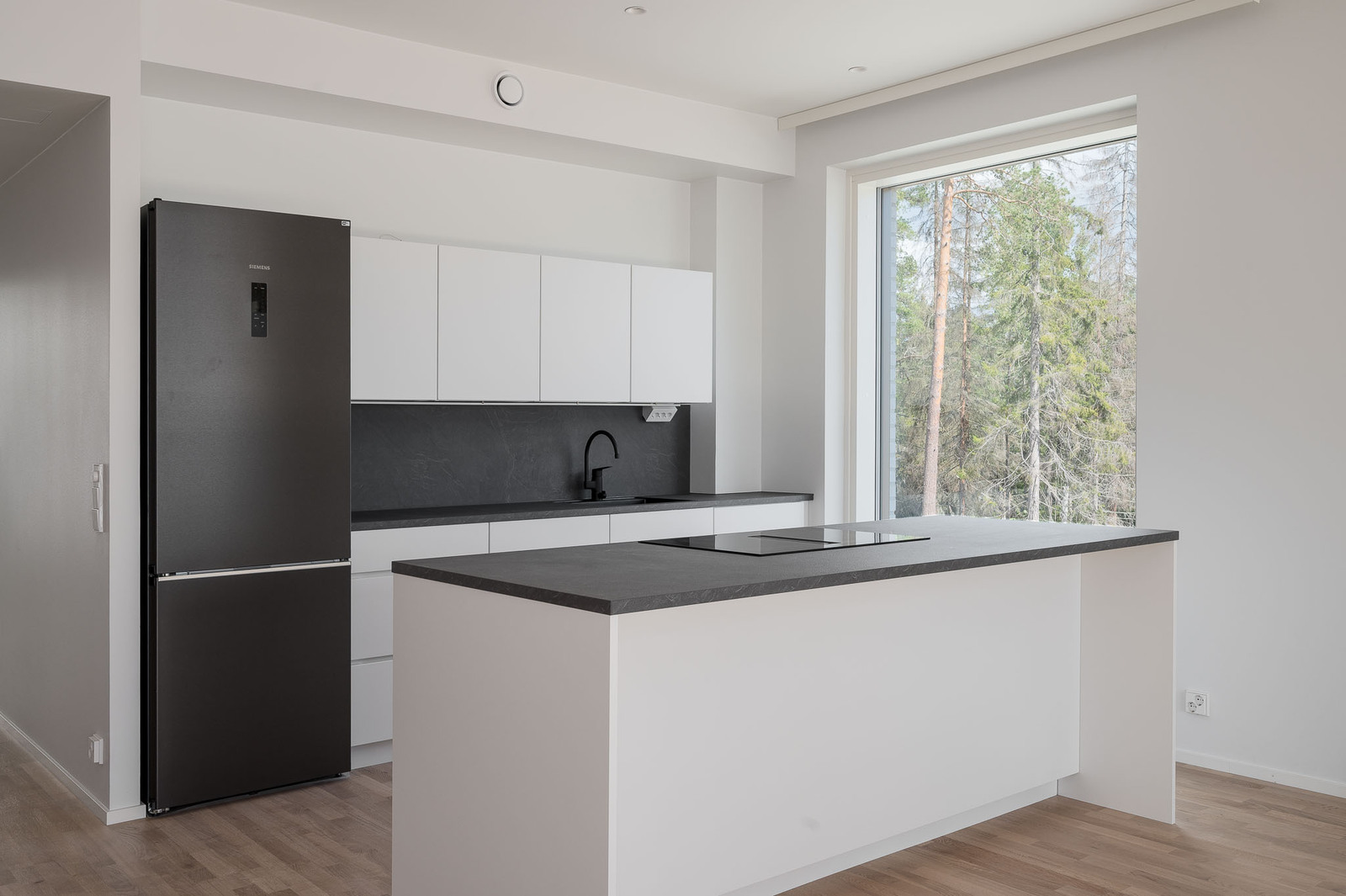 Valkoinen hyvin varusteltu KVIKin avokeittiö, jossa toiminnallinen saarreke. Työtasot ja välitila ovat tummaa laminaattia. Keittiössä on Siemensin kodinkoneet, erillisuuni mikroaaltotoiminnolla, induktioliesitaso integroidulla liesituulettimella, jääkaappi/pakastin ja integroitu astianpesukone.
