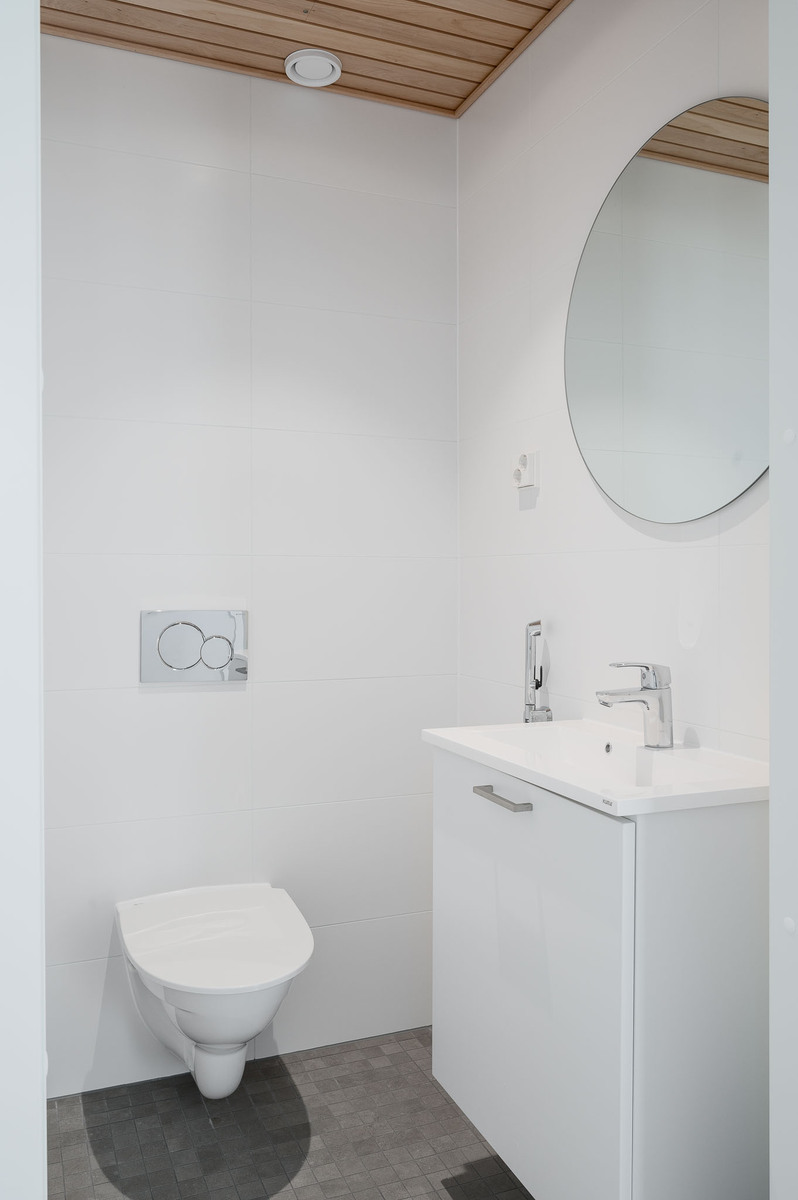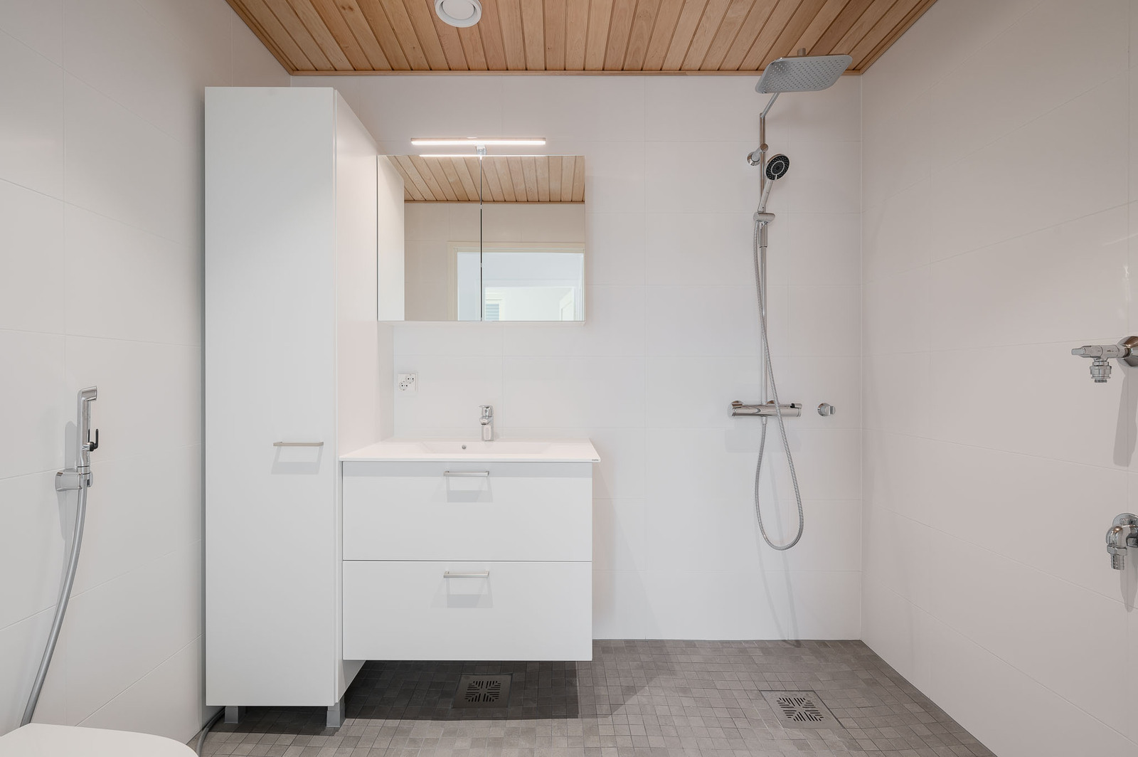 Kylpyhuoneessa wc-istuin, allaskaappi, peilikaappi, bidee-suihku, pesukoneliitäntä, suihku ja suihkuseinät. Seinät kaakeloitu ja lattiat laattaa sähkötoimisella mukavuuslattialämmityksellä.