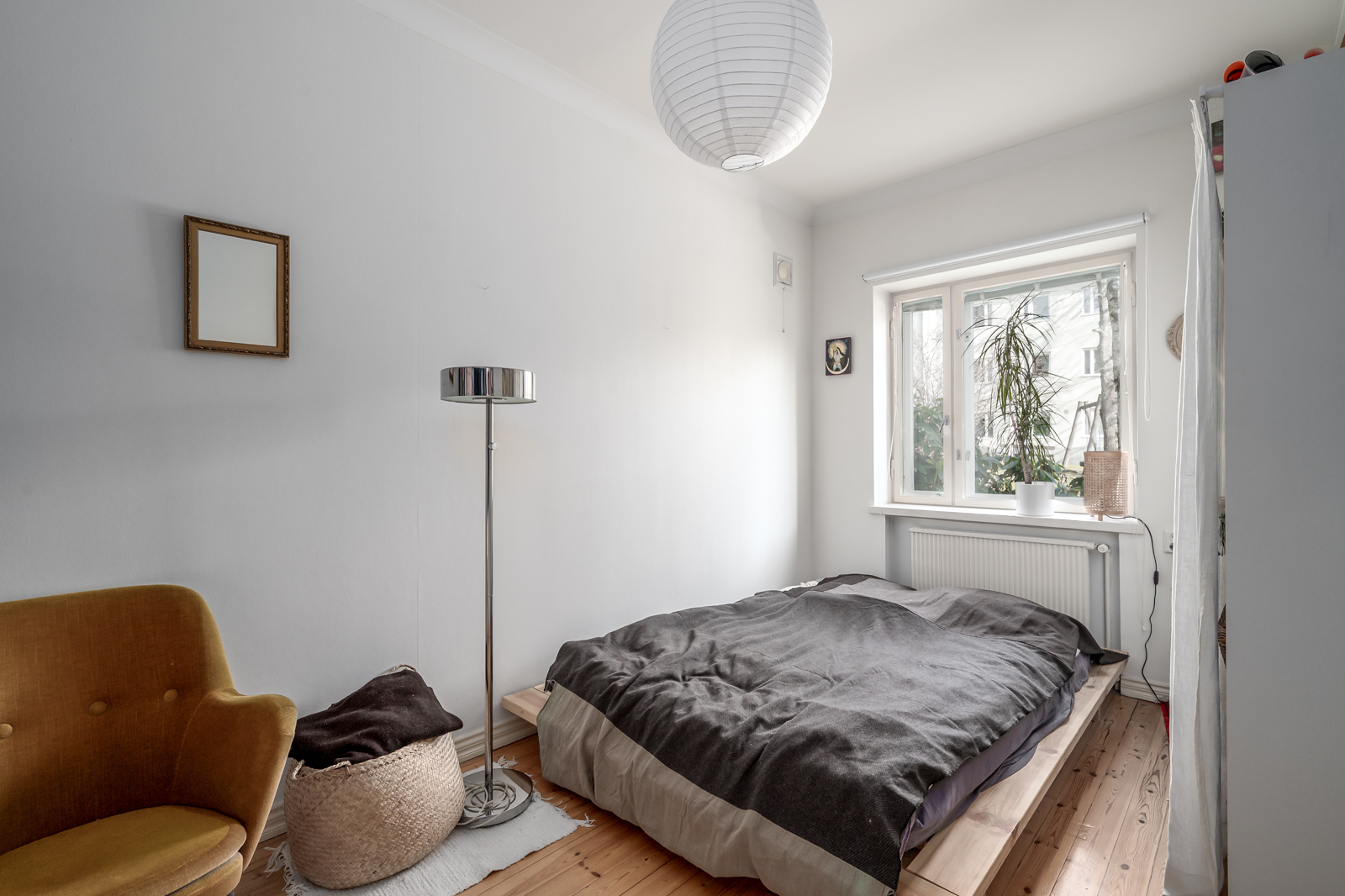 Mh1: Hyvän kokoinen makuuhuone, jossa vaatekaappi ja ikkunassa sälekaihtimet. Lautalattia ja seinät maalattu. Mh2: Olohuoneen yhteydessä valoisa huone, josta voi muodostaa makuuhuoneen tai vaikka työhuoneen. |