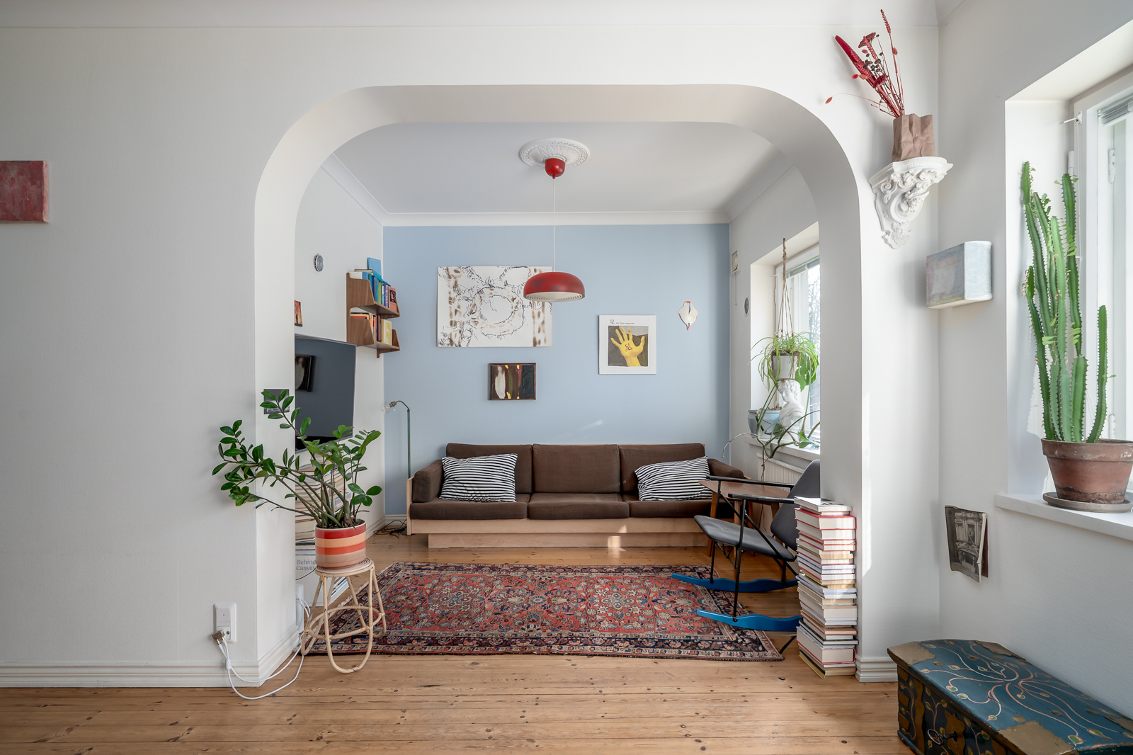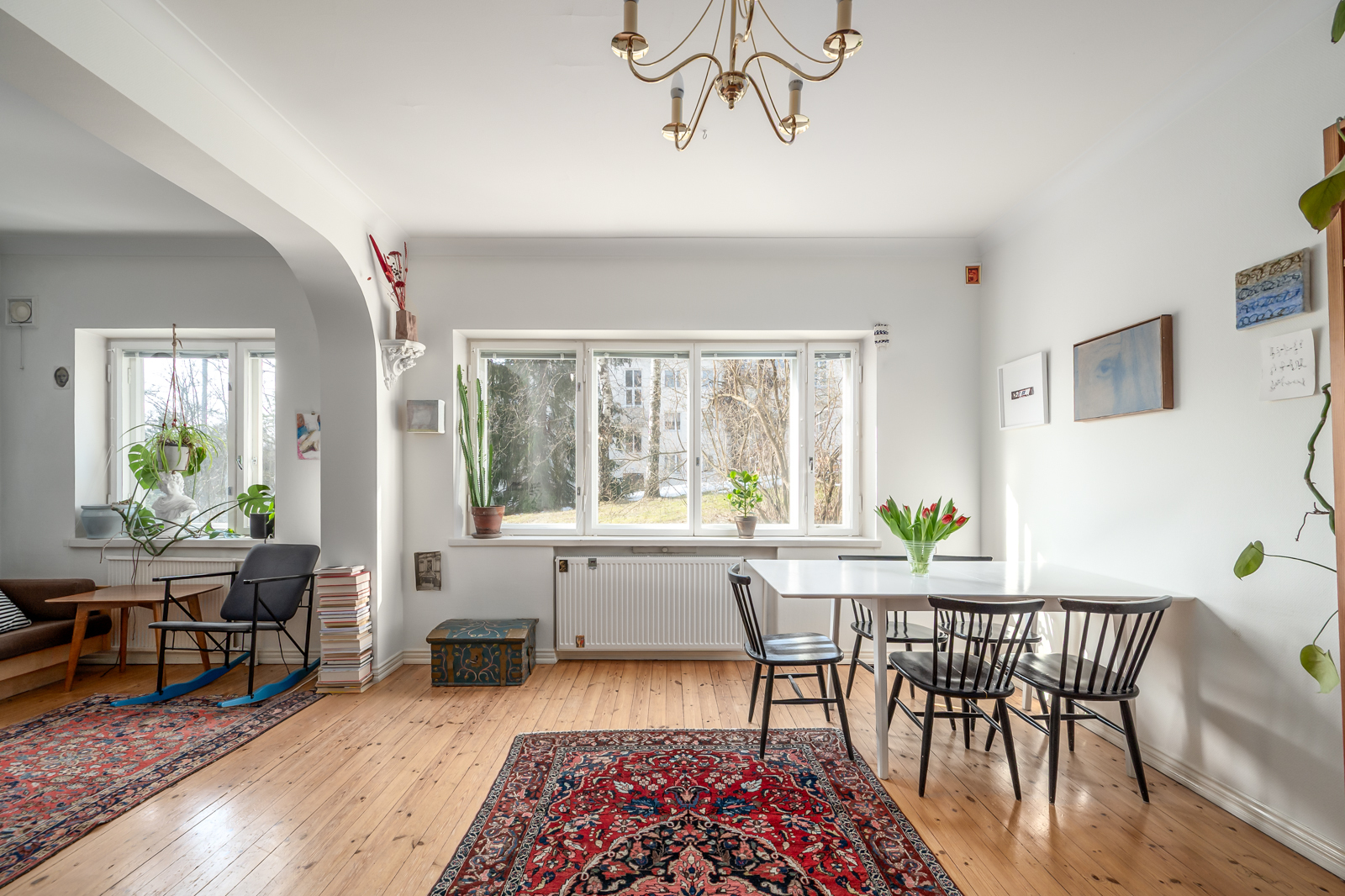 Avara ja valoisa olohuone. Kaikissa ikkunoissa sälekaihtimet. Lautalattia ja seinät maalattu. |