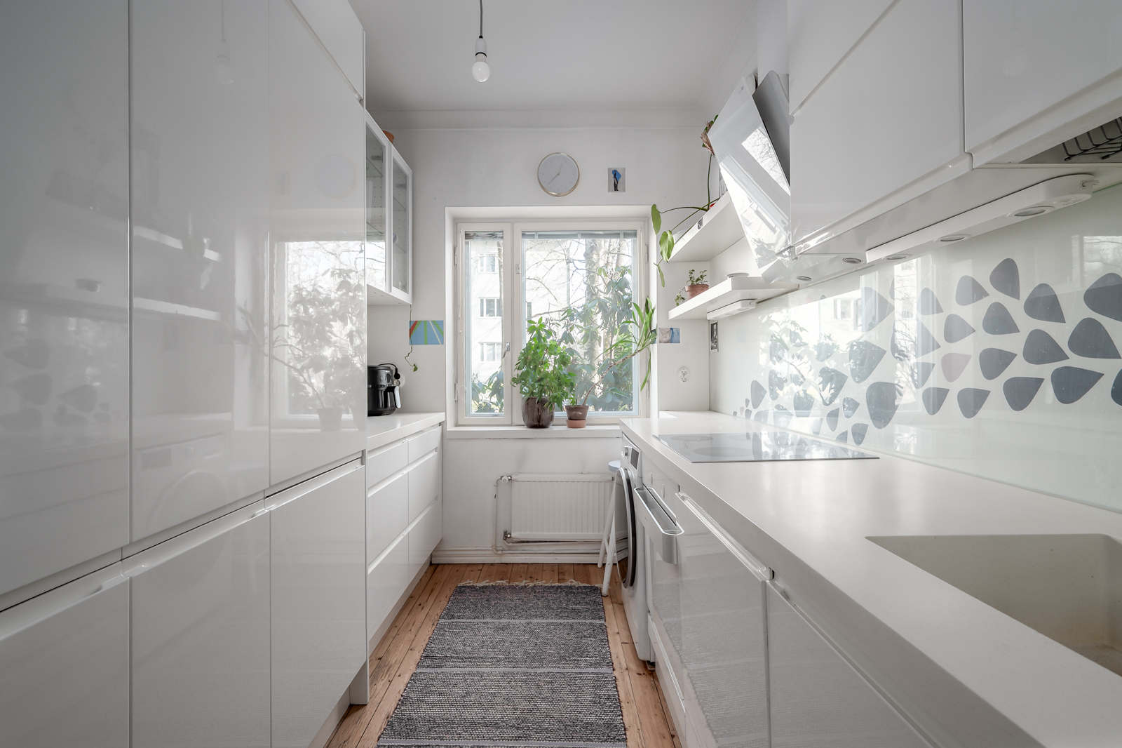 Tyylikkäässä modernissa keittiössä on riittävästi säilytystilaa ja laadukkaat keittiölaitteet. Varusteet: Vaaleat kaapistot ja kalusteet, jääkaappipakastin, induktioliesitaso, erillisuuni, astianpesukone, liesituuletin ja kiinteät valaisimet. Pinnat: Durat työtasot, välitila kalustelevy ja lautalattia. |