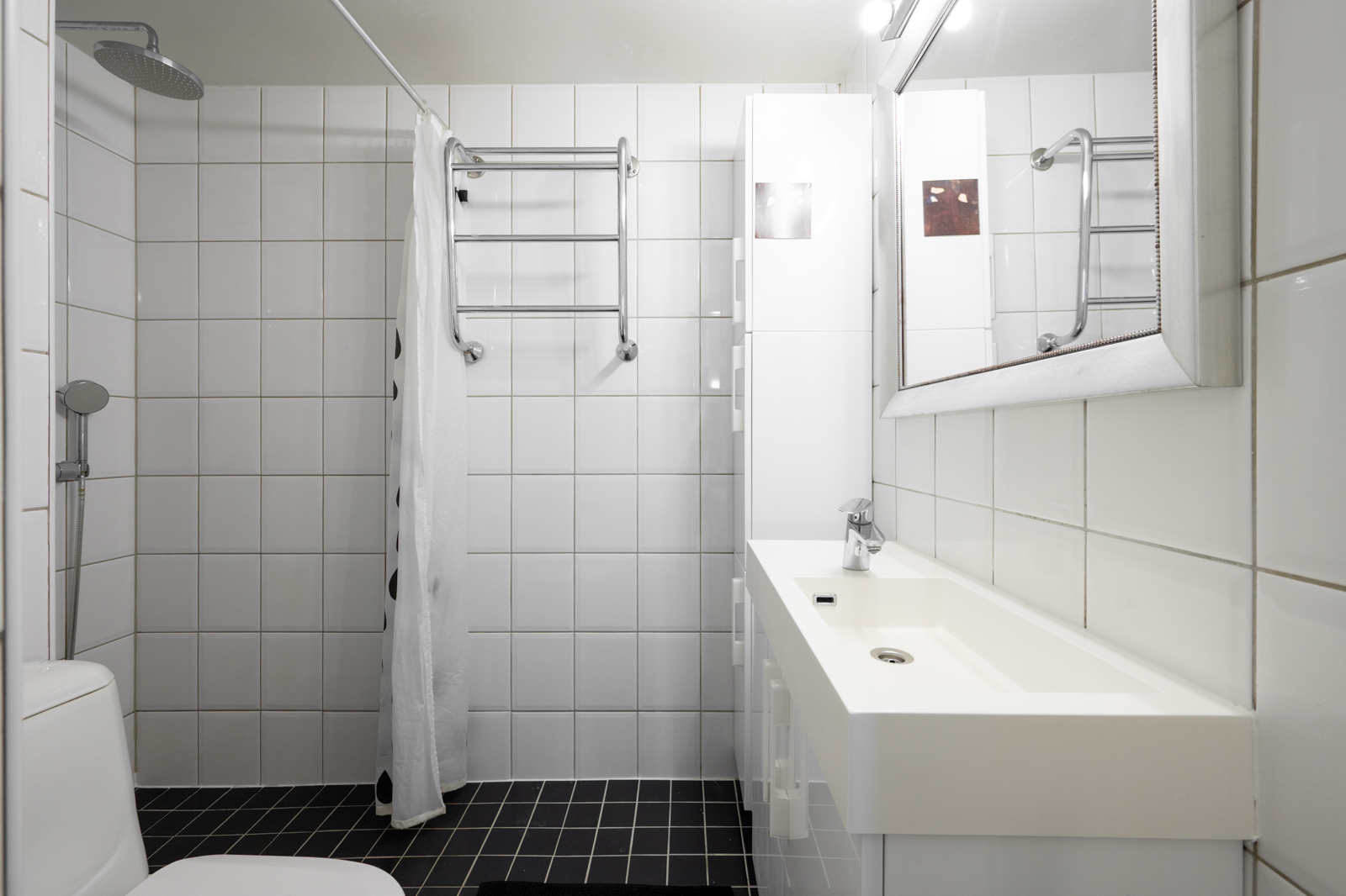 Kylpyhuone lattialämmityksellä. Varusteet: Suihku, suihkuverho, käsisuihku, pyyhekuivain, peilikaappi, allaslaatikosto. |