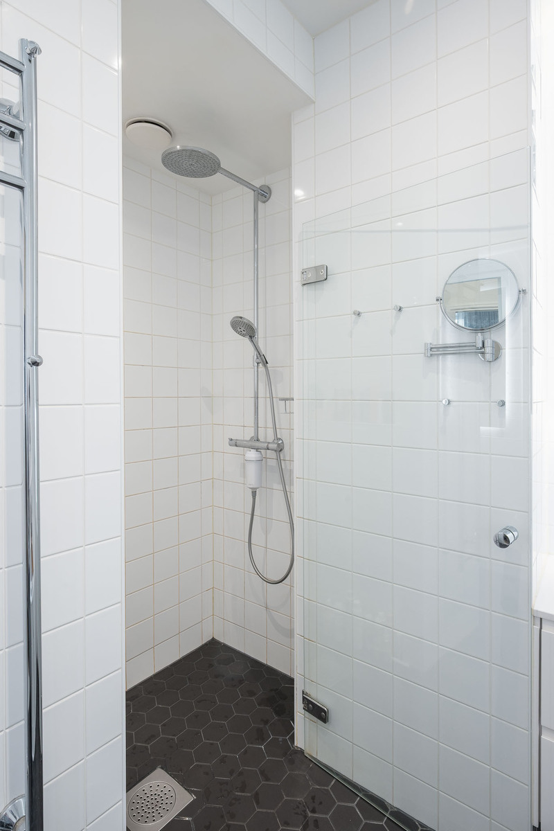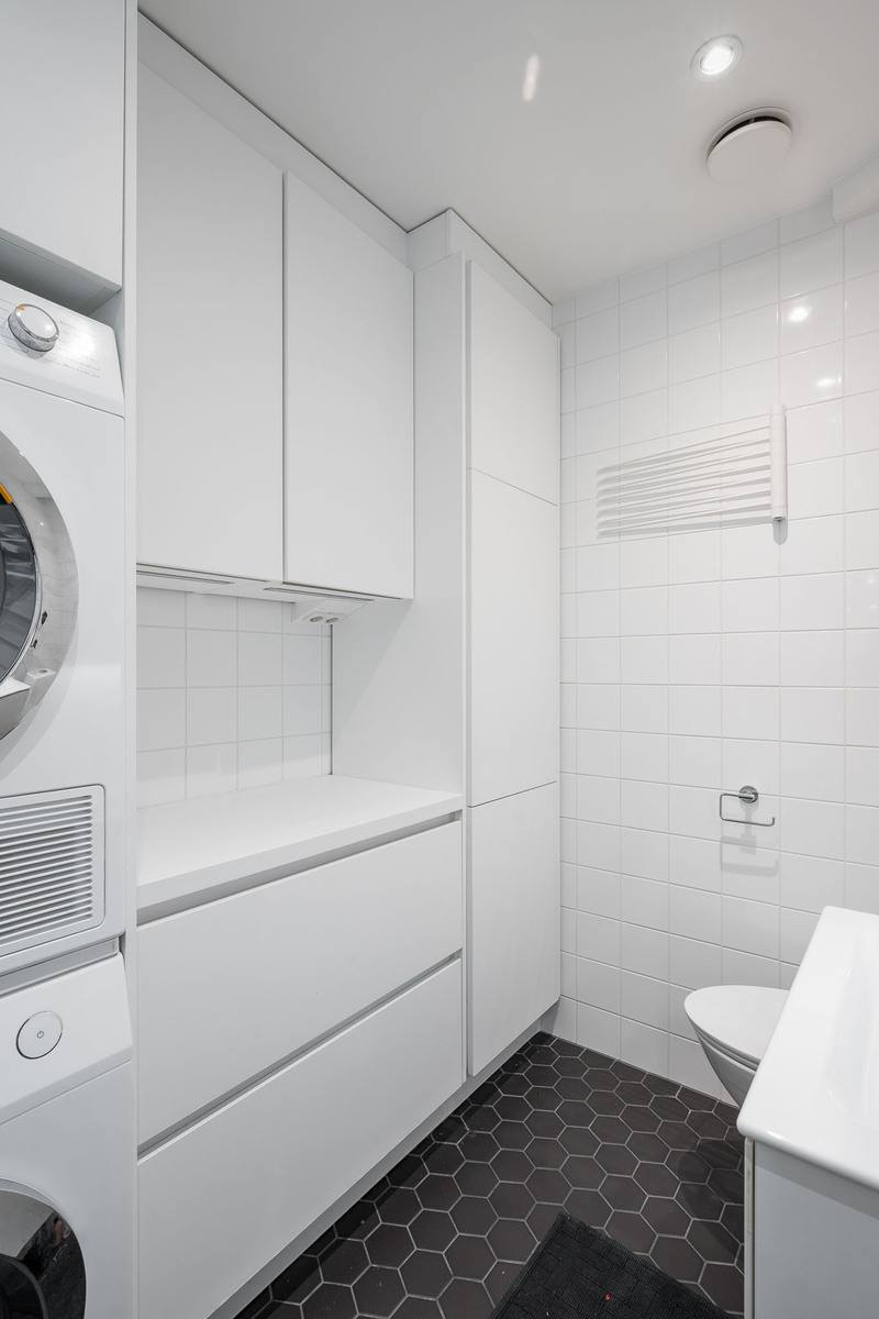 Kodinhoitohuoneessa wc-istuin, bidee-suihku, allaskaapisto, peilikaappi ja pyyhekuivain. Mukavasti kaappitilaa sekä tila pesutornille. Lattia laatoitettu, lattialämmitys. Seinät kaakeloitu. |