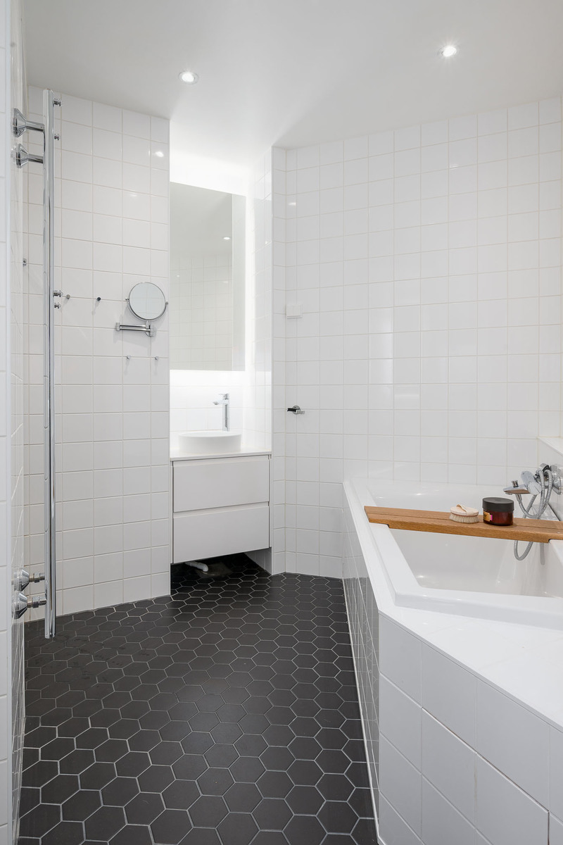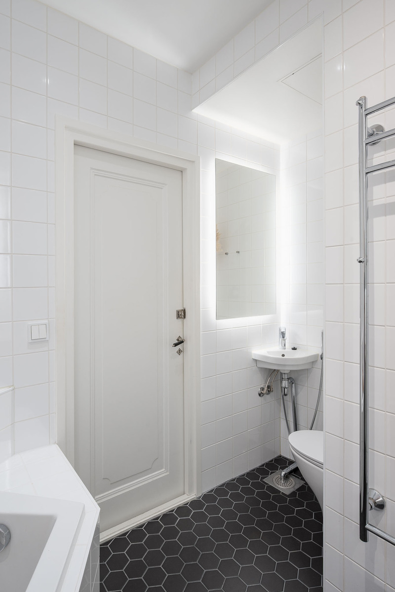 Kylpyhuoneessa seinä-wc, bidee-suihku, pesuallas, suihkunurkkaus sadetinsuihkulla, pyyhekuivain, allaskaapisto, peilikaappi ja kylpyamme. Kylpyhuoneen kalusteet Noblessa ja ammen kotelointi ja taso teetetty puusepällä. Lattia laatoitettu, seinät kaakeloitu. |