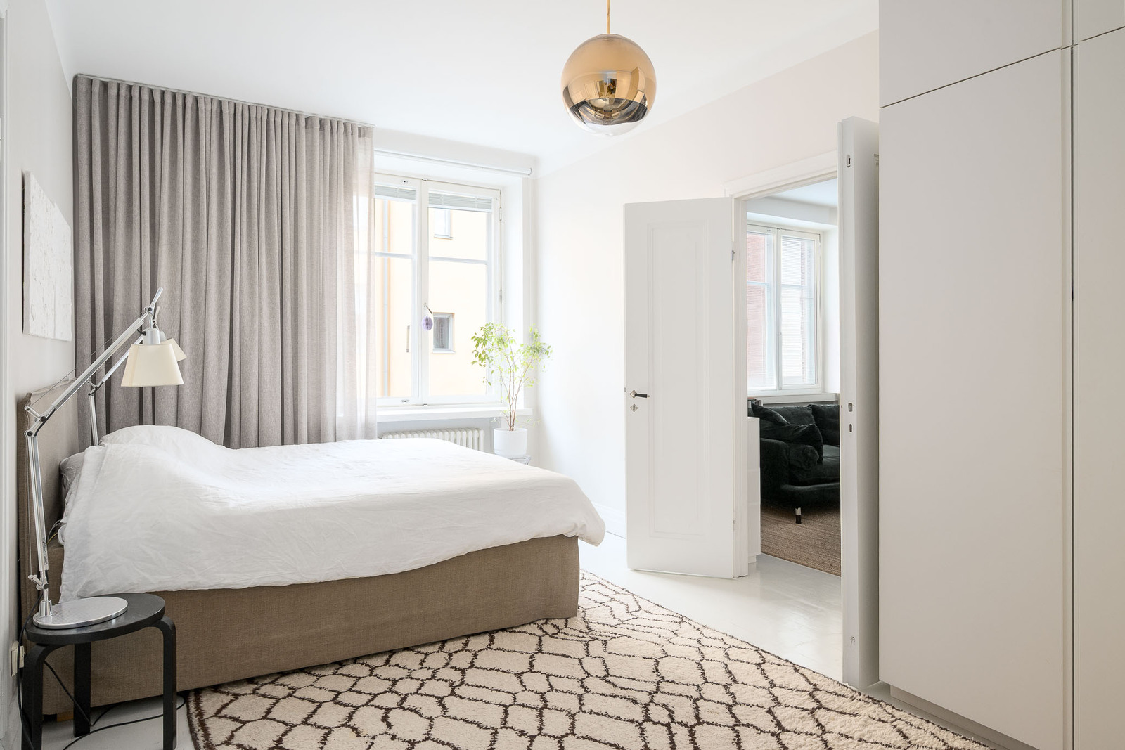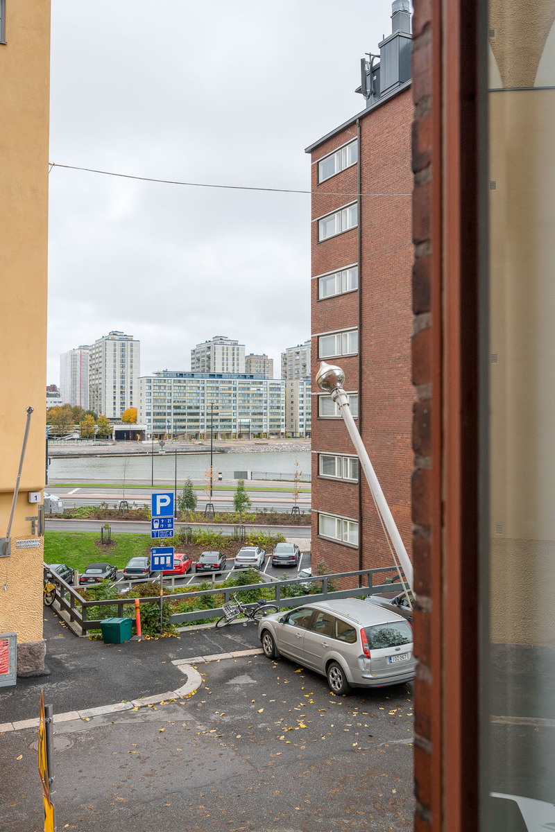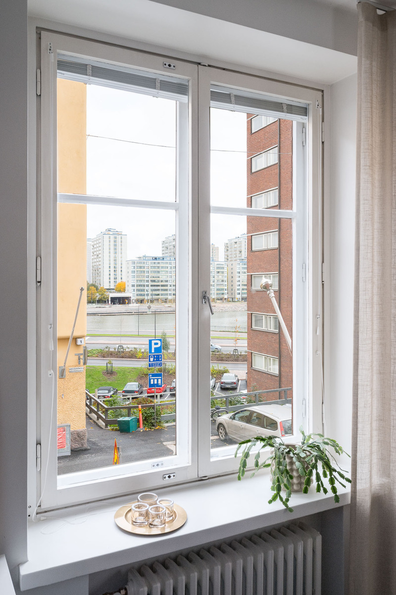 Kristianinkadun ja Maurinkadun kulmaan sijoittuva erittäin tilava olohuone, joka yhdistyy avokeittiöön. Näkymä Siltavuorensalmelle. Olohuoneeseen mahtuu sohvakaluston lisäksi suurempikin ruokapöytä. Kunnostetut alkuperäiset pariovet avautuvat päämakuuhuoneeseen. |