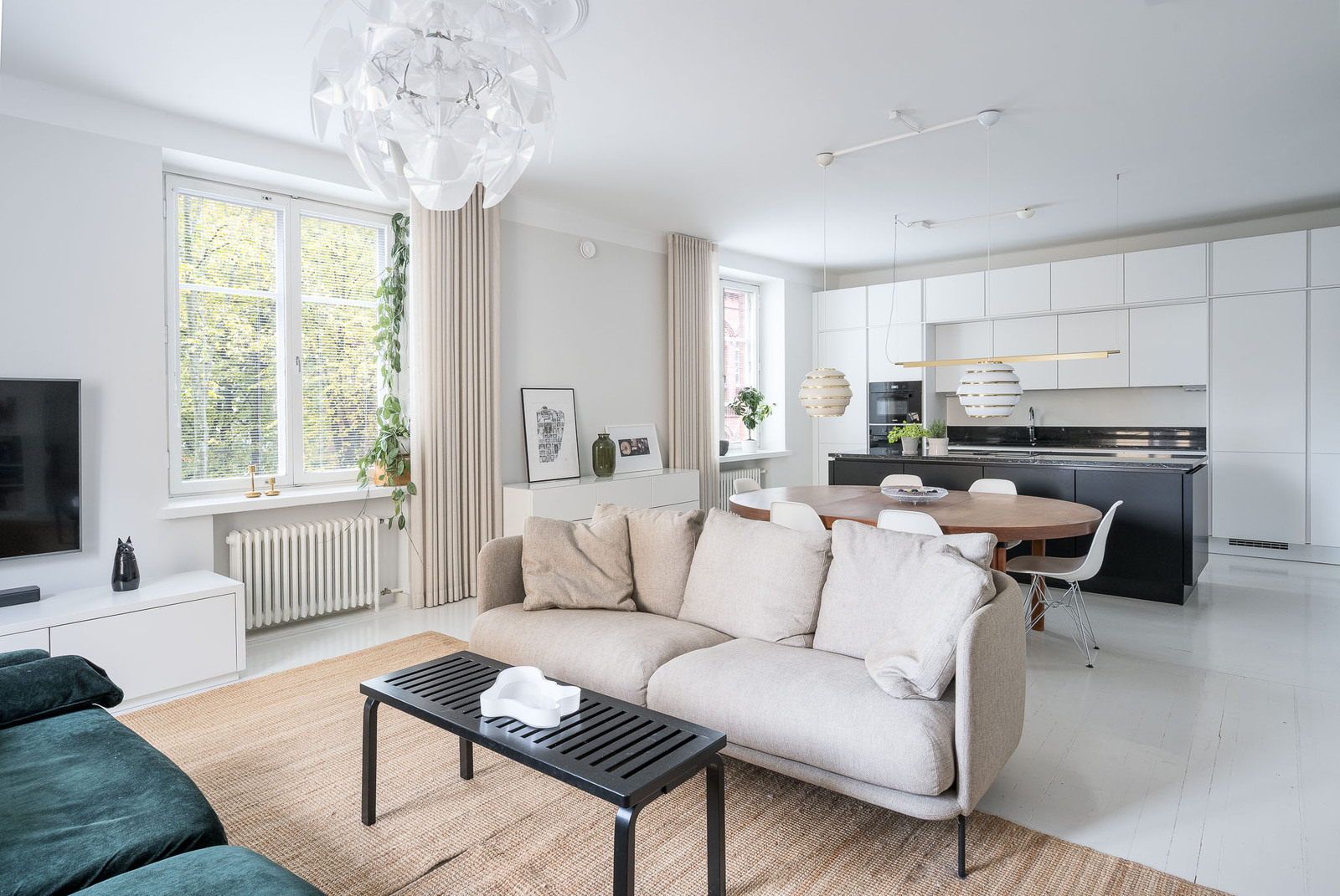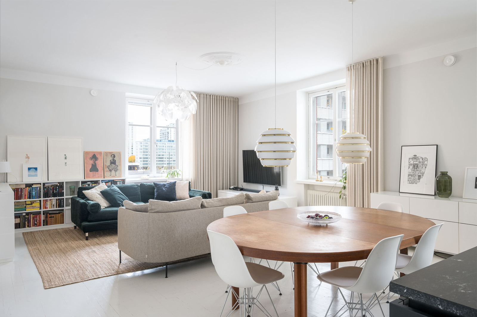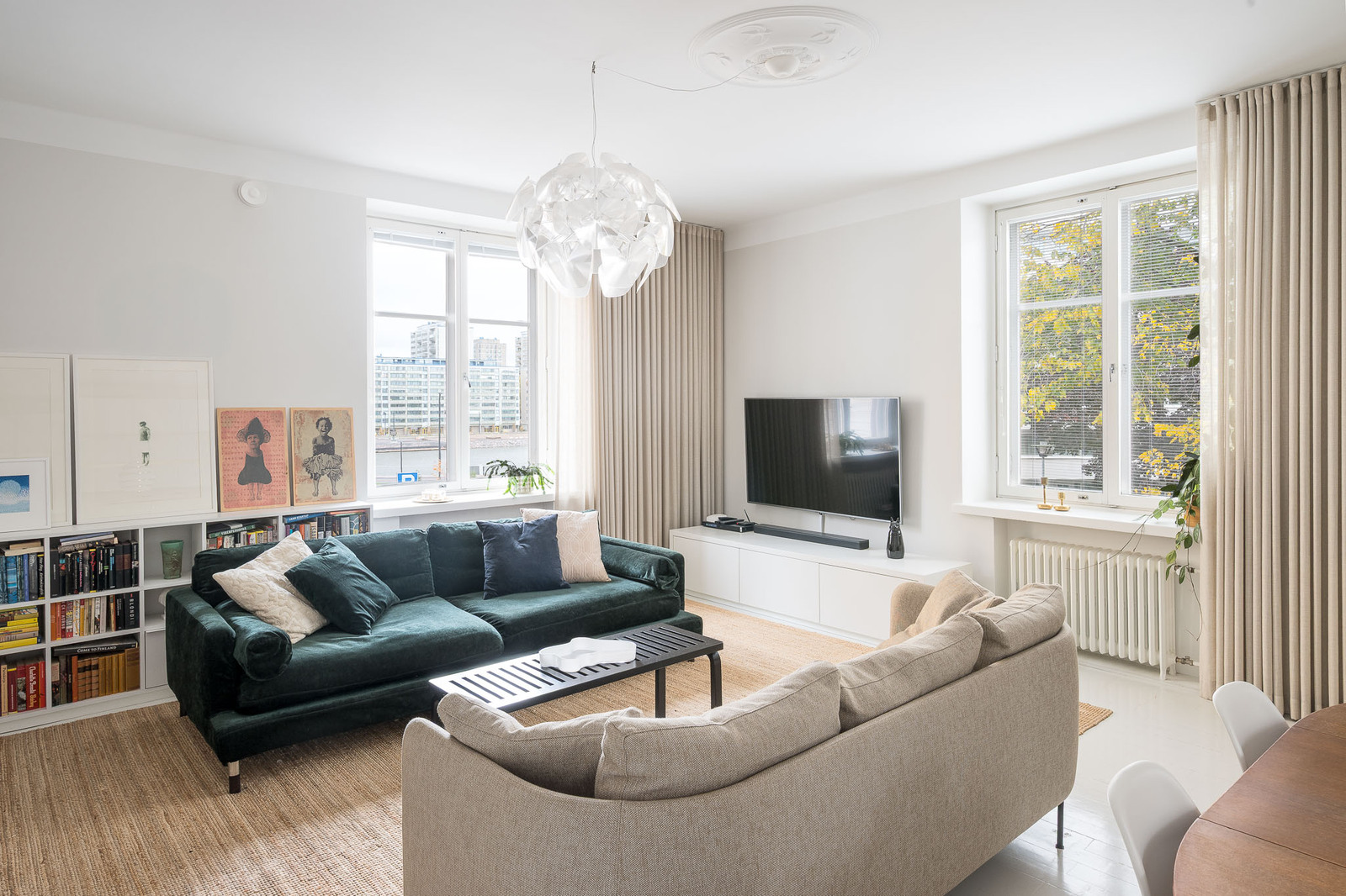 Kristianinkadun ja Maurinkadun kulmaan sijoittuva erittäin tilava olohuone, joka yhdistyy avokeittiöön. Näkymä Siltavuorensalmelle. Olohuoneeseen mahtuu sohvakaluston lisäksi suurempikin ruokapöytä. Kunnostetut alkuperäiset pariovet avautuvat päämakuuhuoneeseen. |