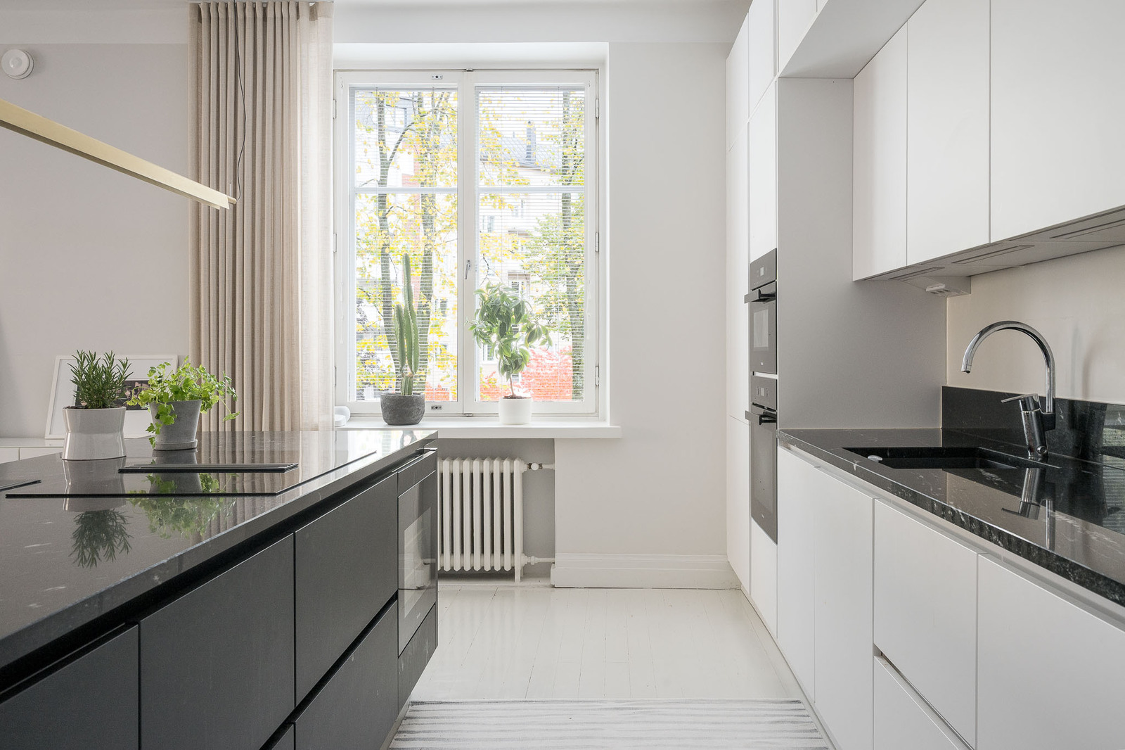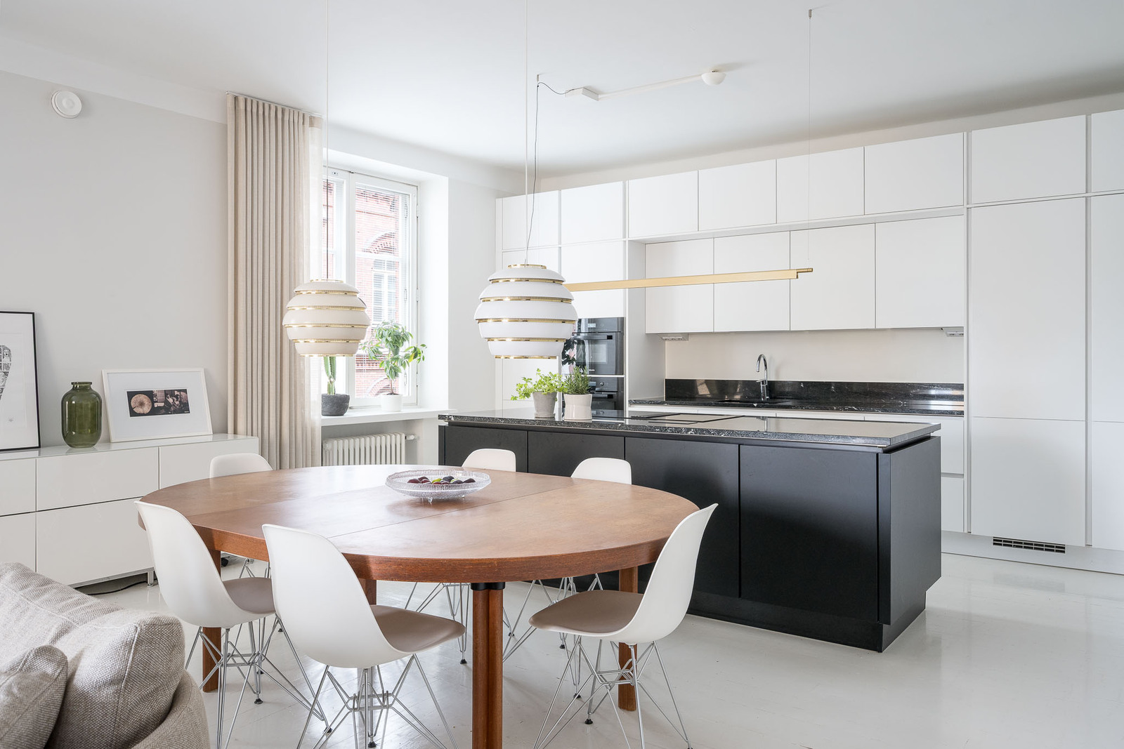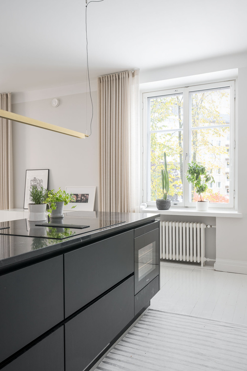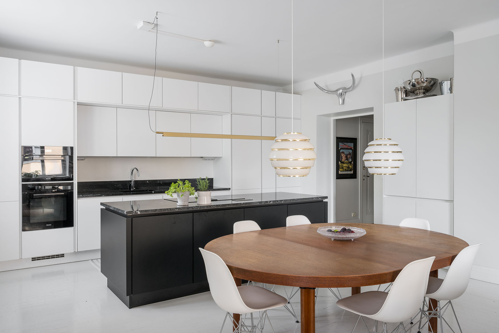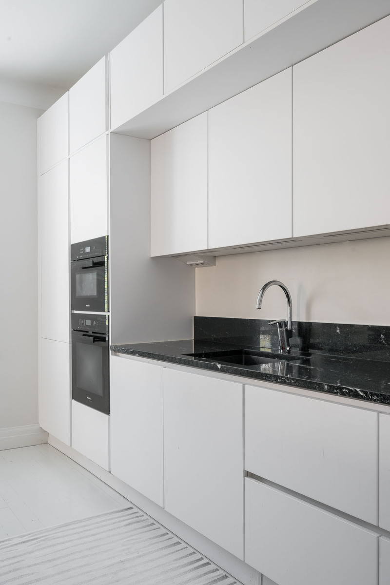 Noblessa avokeittiö, jossa suuri toiminnallinen saareke. Mattavalkoiset ja mustat kaapistot, tasot kestävää graniittia. Mielen integroidut kodinkoneet, täyskorkeat jääkaappi ja pakastinkaappi, tavallinen uuni pyrolyysiominaisuuksialla, mikro/ höyryuuni- yhdistelmä, Bosch astianpesukone. Saarekkeeseen sijoitettu induktioliesi integroidulla liesituulettimella sekä 15 pullon viinikaappi. |