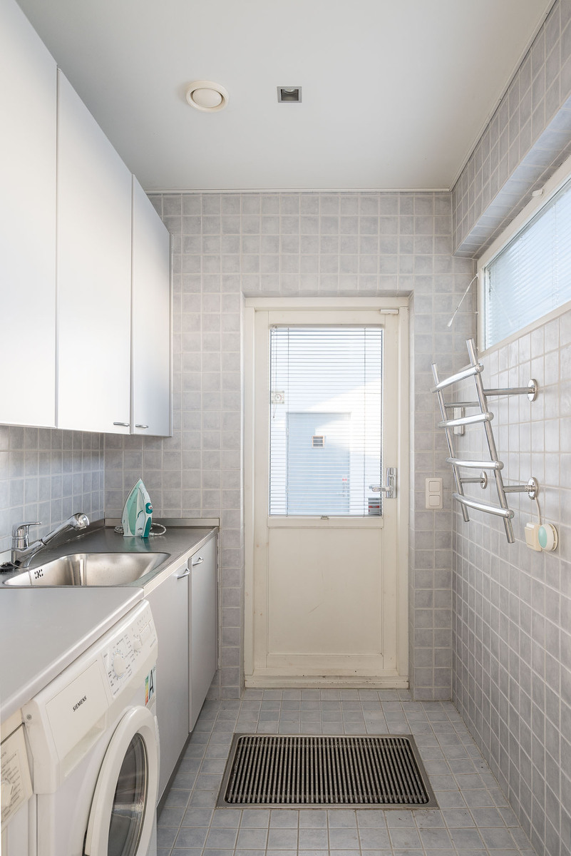 Kodinhoitohuoneessa kaapistot, pyyhekuivain, pesuallas sekä tason alle sijoitetut pyykinpesukone ja kuivaaja. Kodinhoitohuoneessa on kurapiste sekä kulku ulos. |