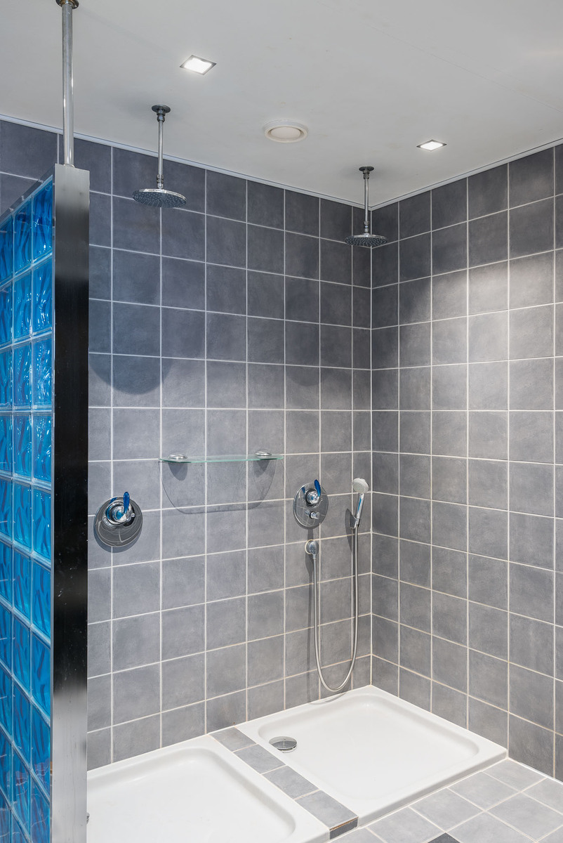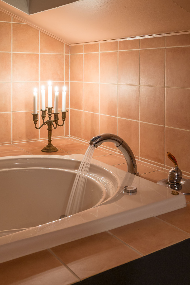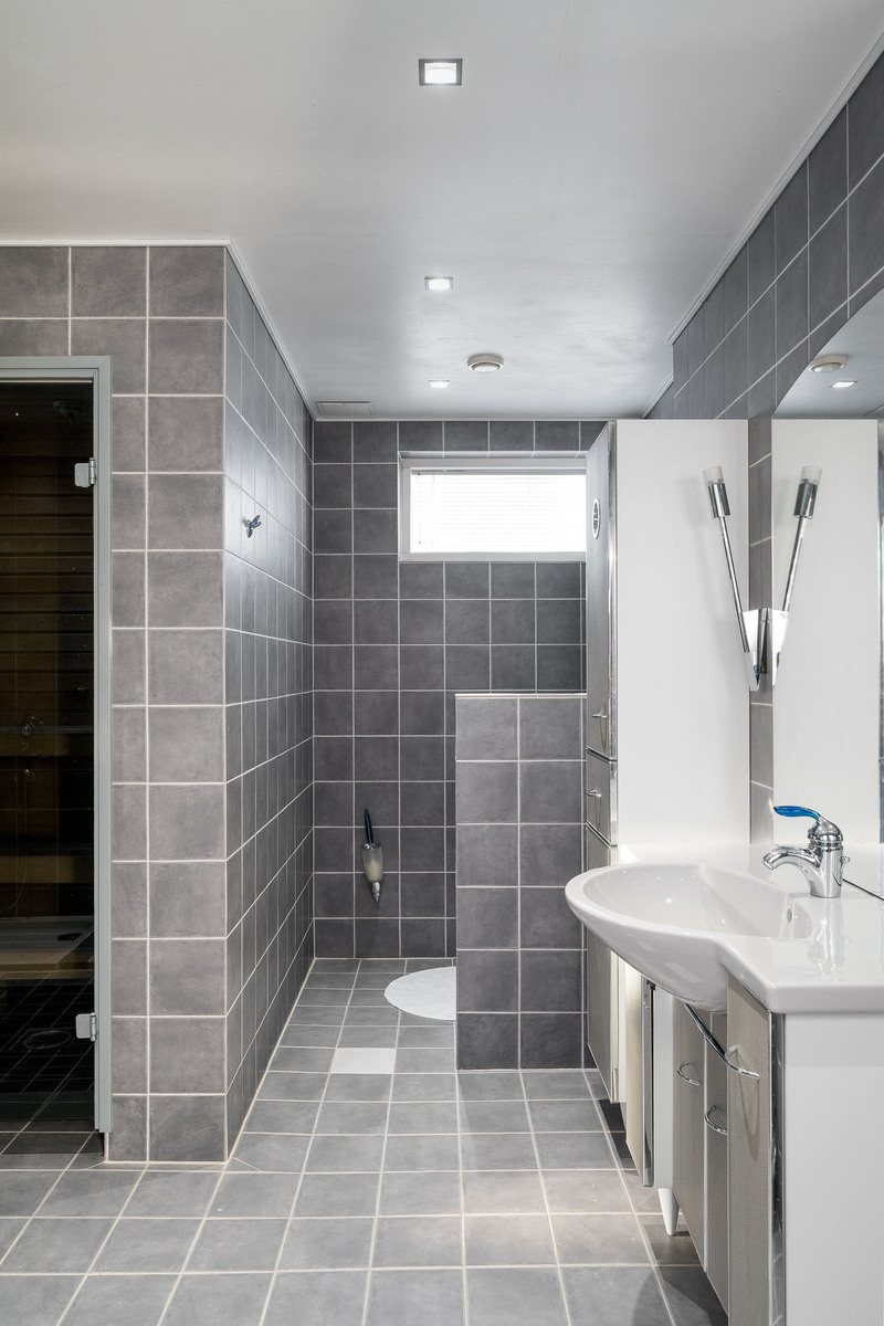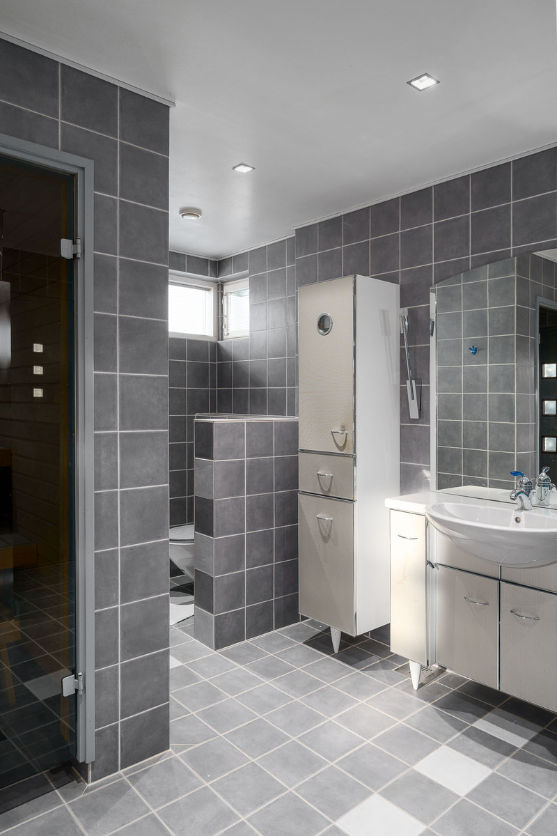 Alakerran kylpyhuoneessa laattalattia ja seinät kaakeloitu. Kylpyhuoneessa on allaskaapisto, peili, kaksi sadesuihkua sekä wc-istuin. Kylpyhuoneen yhteydessä ikkunallinen sauna sekä käynti suuremmalle lasitettulle terassille. Yläkerrassa päämakuuhuoneen yhteydessä toinen kylpyhuone, jossa lattia laattaa ja seinät kaakeloitu. Kylpyhuoneessa on wc-istuin, bidee-suihku, suihkusyvennys, allaskaapisto, peili sekä poreamme. |