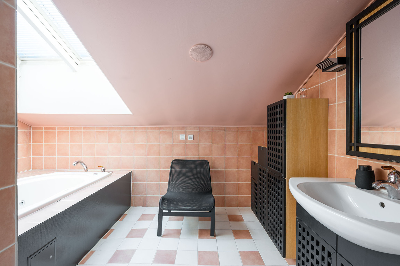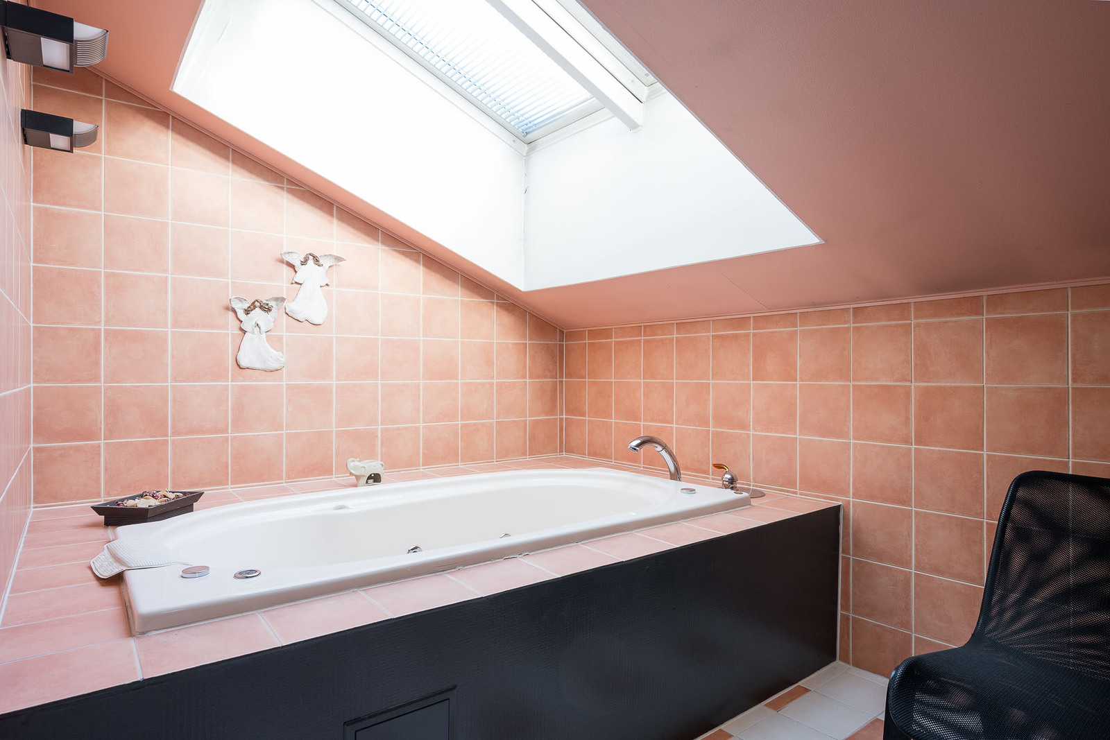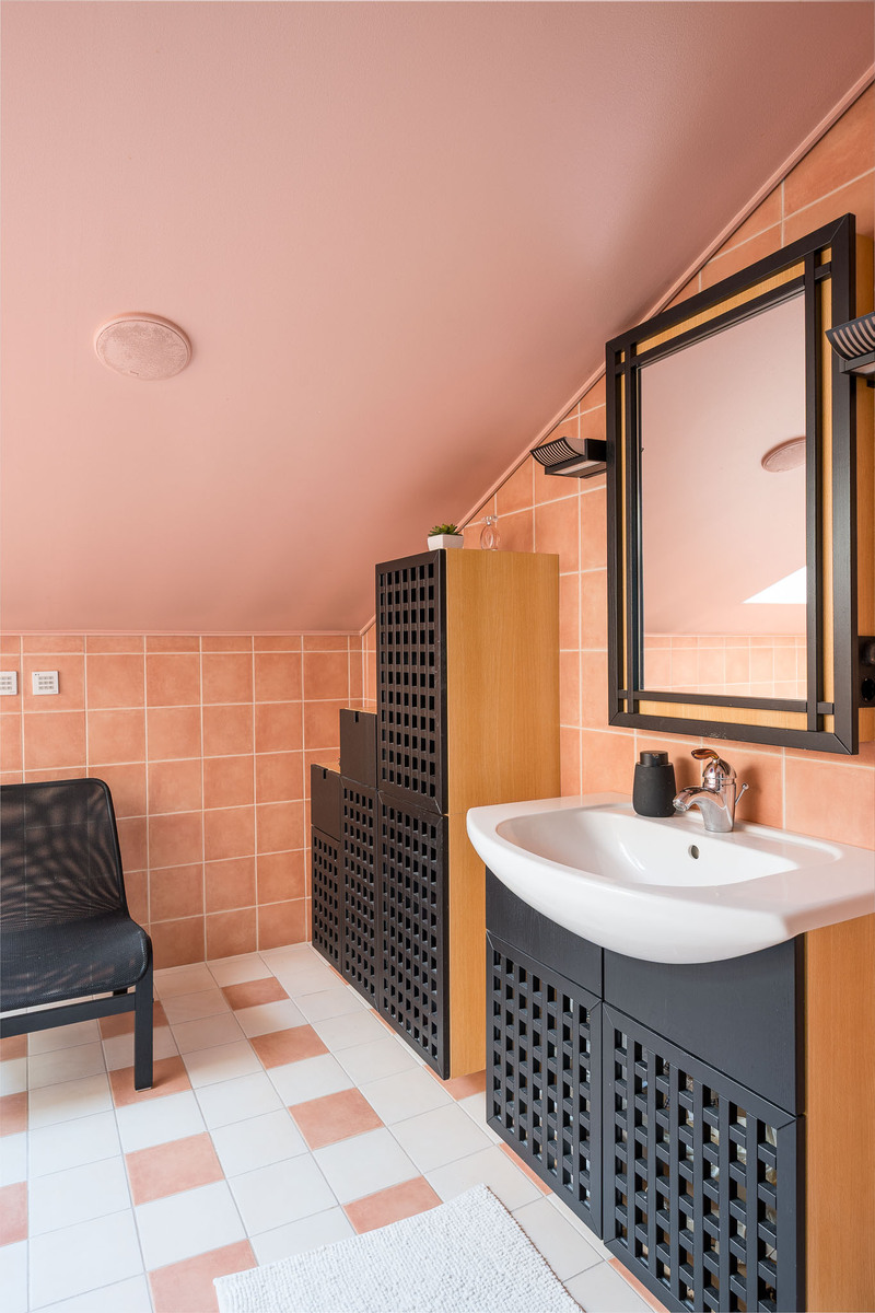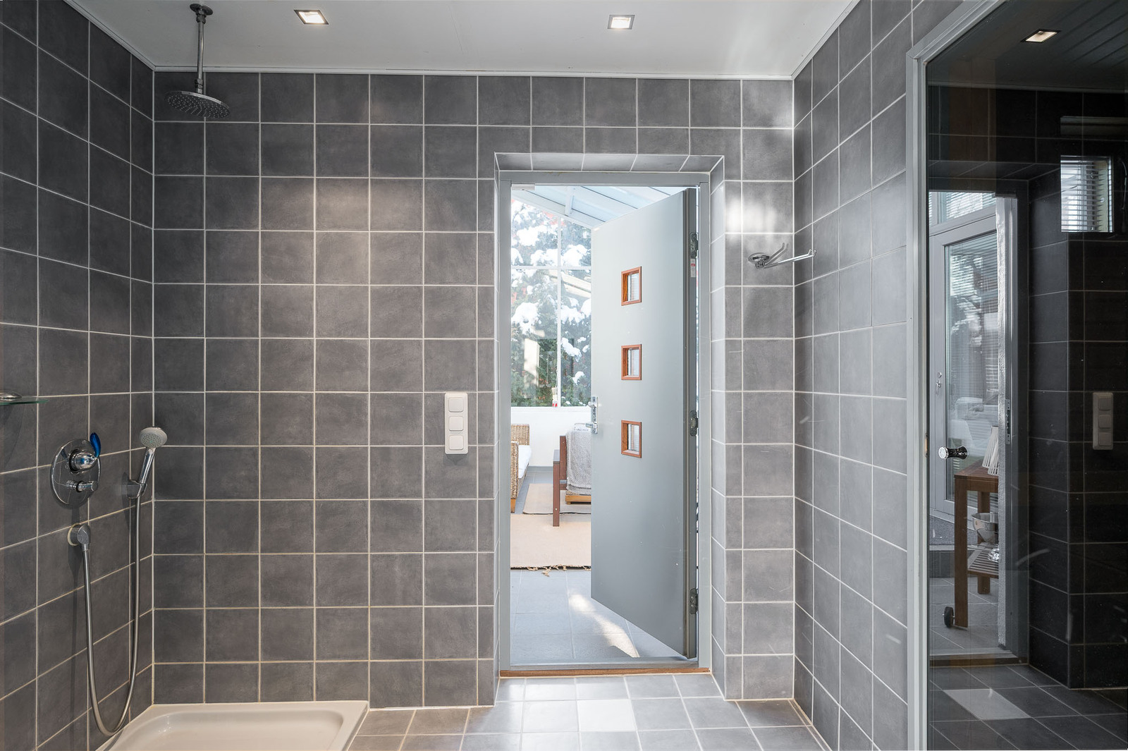 Alakerran kylpyhuoneessa laattalattia ja seinät kaakeloitu. Kylpyhuoneessa on allaskaapisto, peili, kaksi sadesuihkua sekä wc-istuin. Kylpyhuoneen yhteydessä ikkunallinen sauna sekä käynti suuremmalle lasitettulle terassille. Yläkerrassa päämakuuhuoneen yhteydessä toinen kylpyhuone, jossa lattia laattaa ja seinät kaakeloitu. Kylpyhuoneessa on wc-istuin, bidee-suihku, suihkusyvennys, allaskaapisto, peili sekä poreamme. |