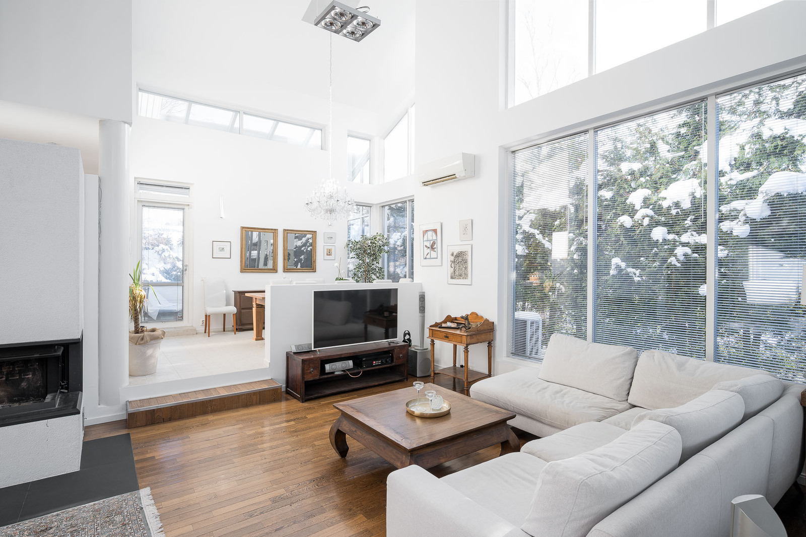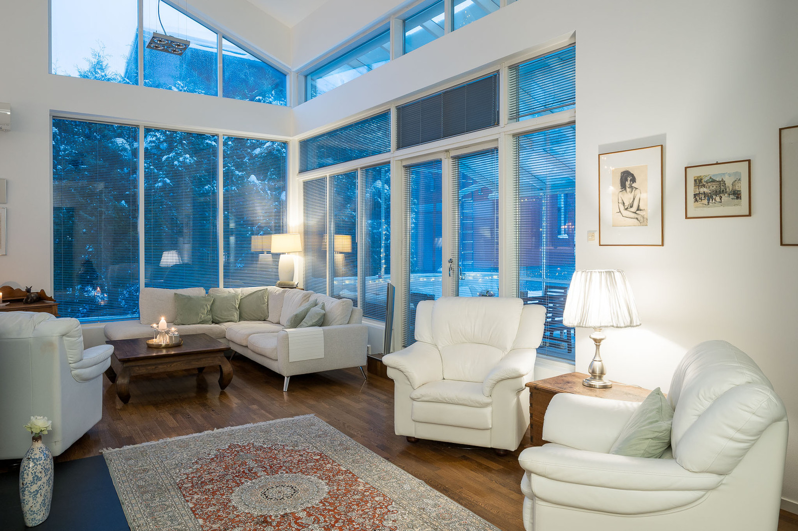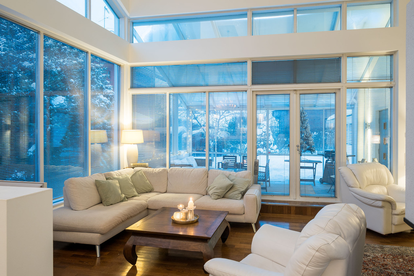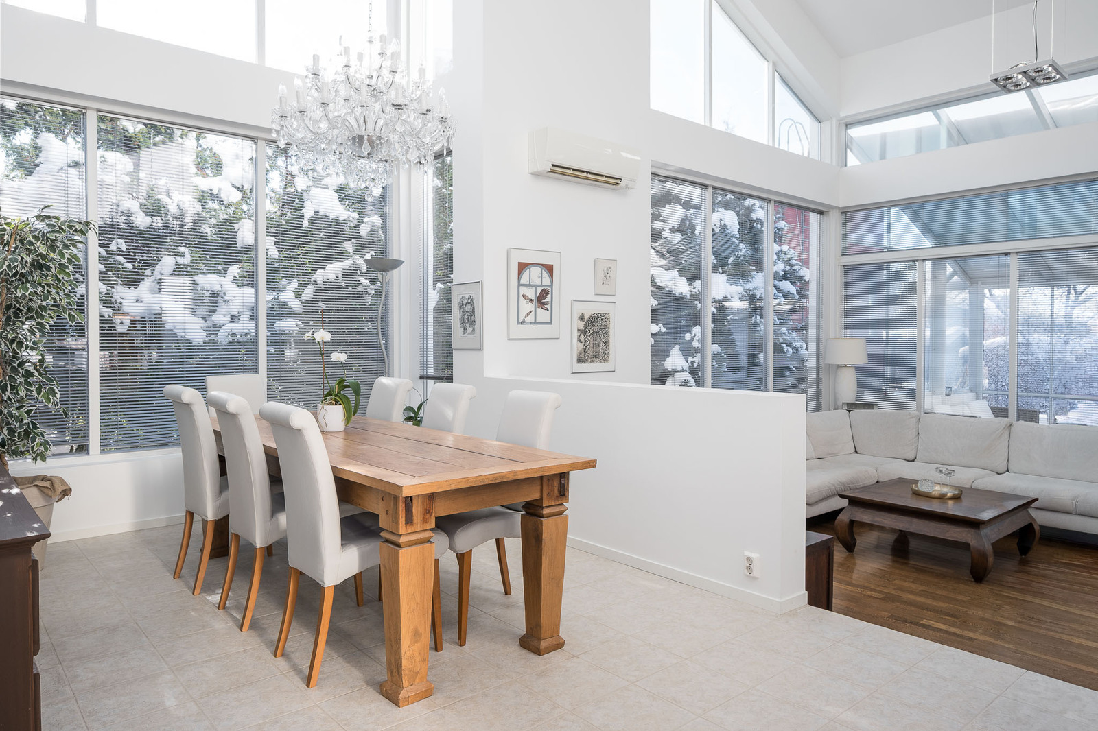 Olohuoneessa on kestävä tummanruskea kovapuulattia. Valtavat ikkunat tuovat tilaan avaruutta ja luonnonvaloa. Huonekorkeus kohoaa noin seitsemään metriin. Olohuoneessa on takka, joka toimii myös lämmönlähteenä ja käynti suurelle lasitetulle terassille. Kaikissa huoneissa on oma, säädettävä lattialämmitys. |