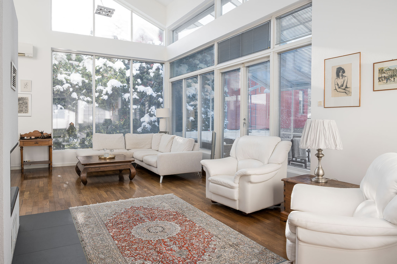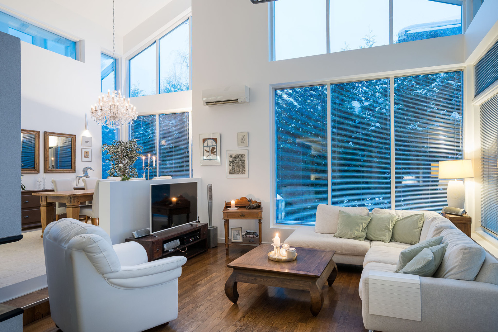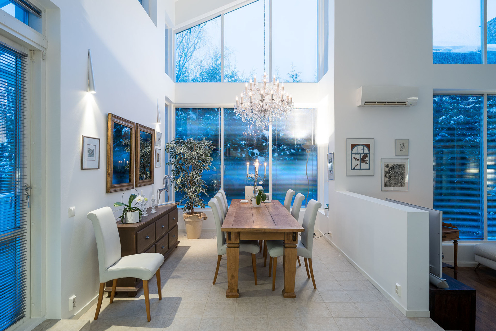 Olohuoneessa on kestävä tummanruskea kovapuulattia. Valtavat ikkunat tuovat tilaan avaruutta ja luonnonvaloa. Huonekorkeus kohoaa noin seitsemään metriin. Olohuoneessa on takka, joka toimii myös lämmönlähteenä ja käynti suurelle lasitetulle terassille. Kaikissa huoneissa on oma, säädettävä lattialämmitys. |