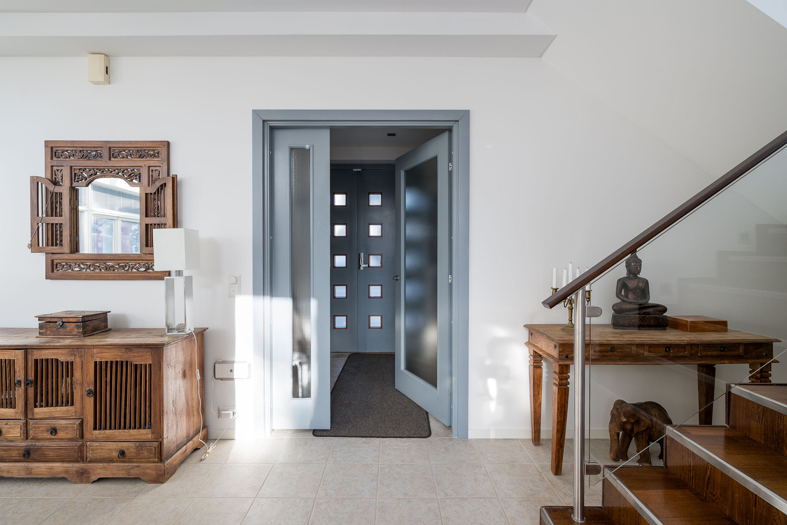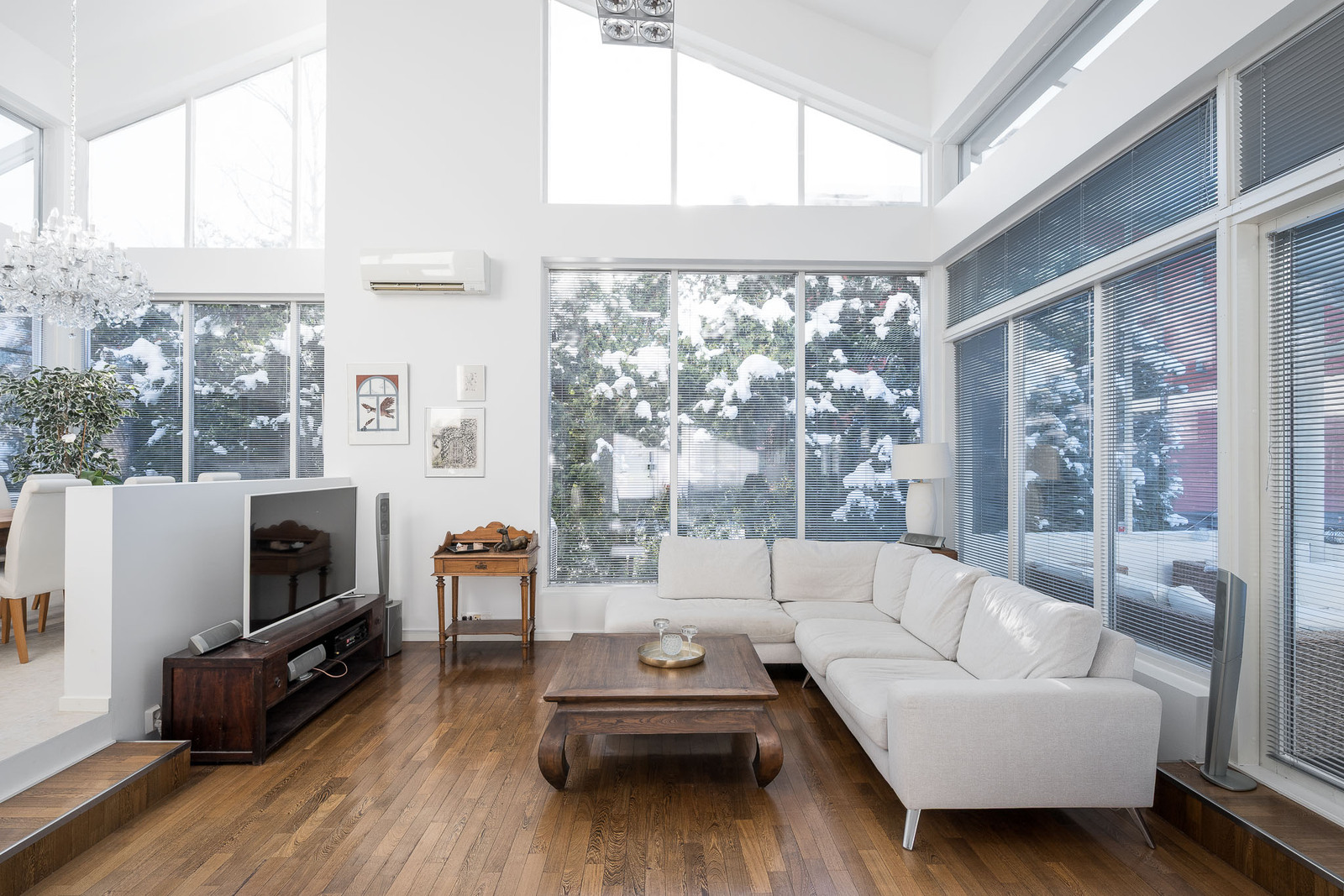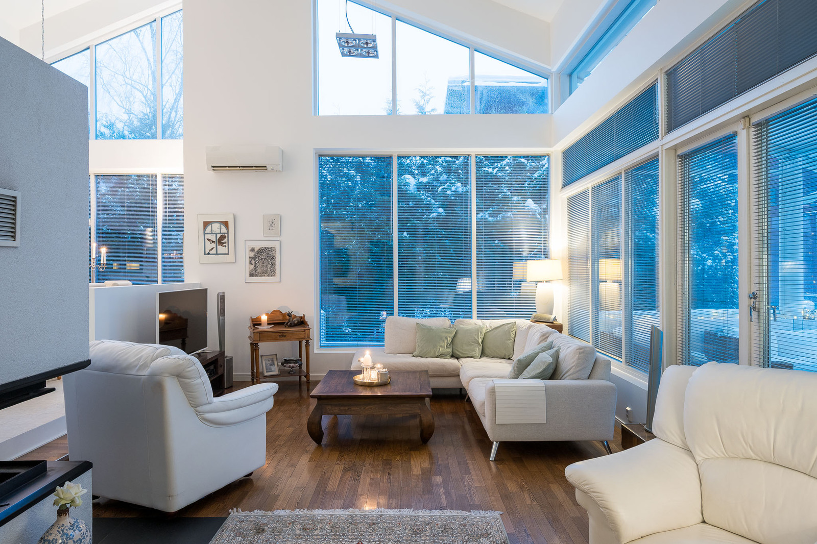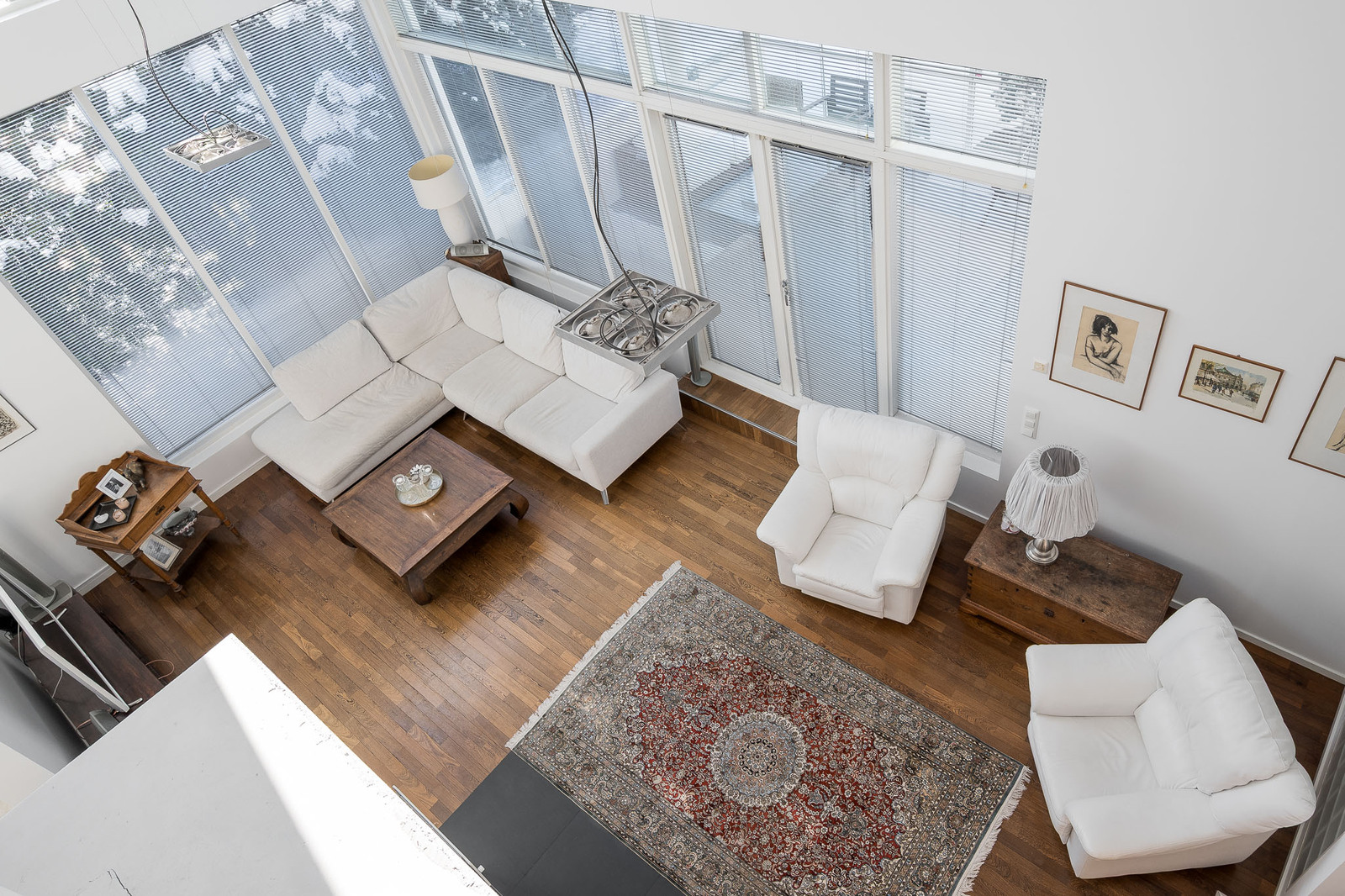 Olohuoneessa on kestävä tummanruskea kovapuulattia. Valtavat ikkunat tuovat tilaan avaruutta ja luonnonvaloa. Huonekorkeus kohoaa noin seitsemään metriin. Olohuoneessa on takka, joka toimii myös lämmönlähteenä ja käynti suurelle lasitetulle terassille. Kaikissa huoneissa on oma, säädettävä lattialämmitys. |