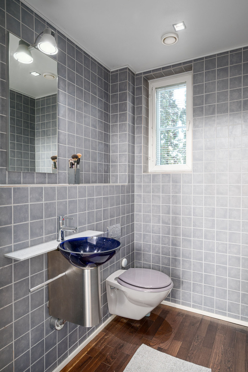 Alakerrassa erillinen wc, jossa parkettilattia ja seinät kaakeloitu. Varustus: seinä-wc, pesuallas, peili. |