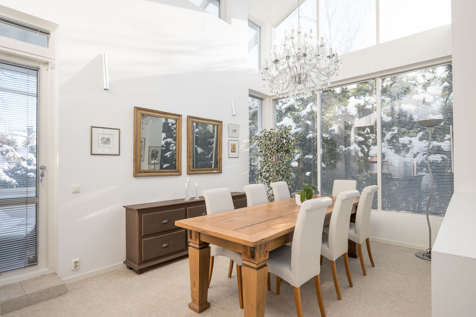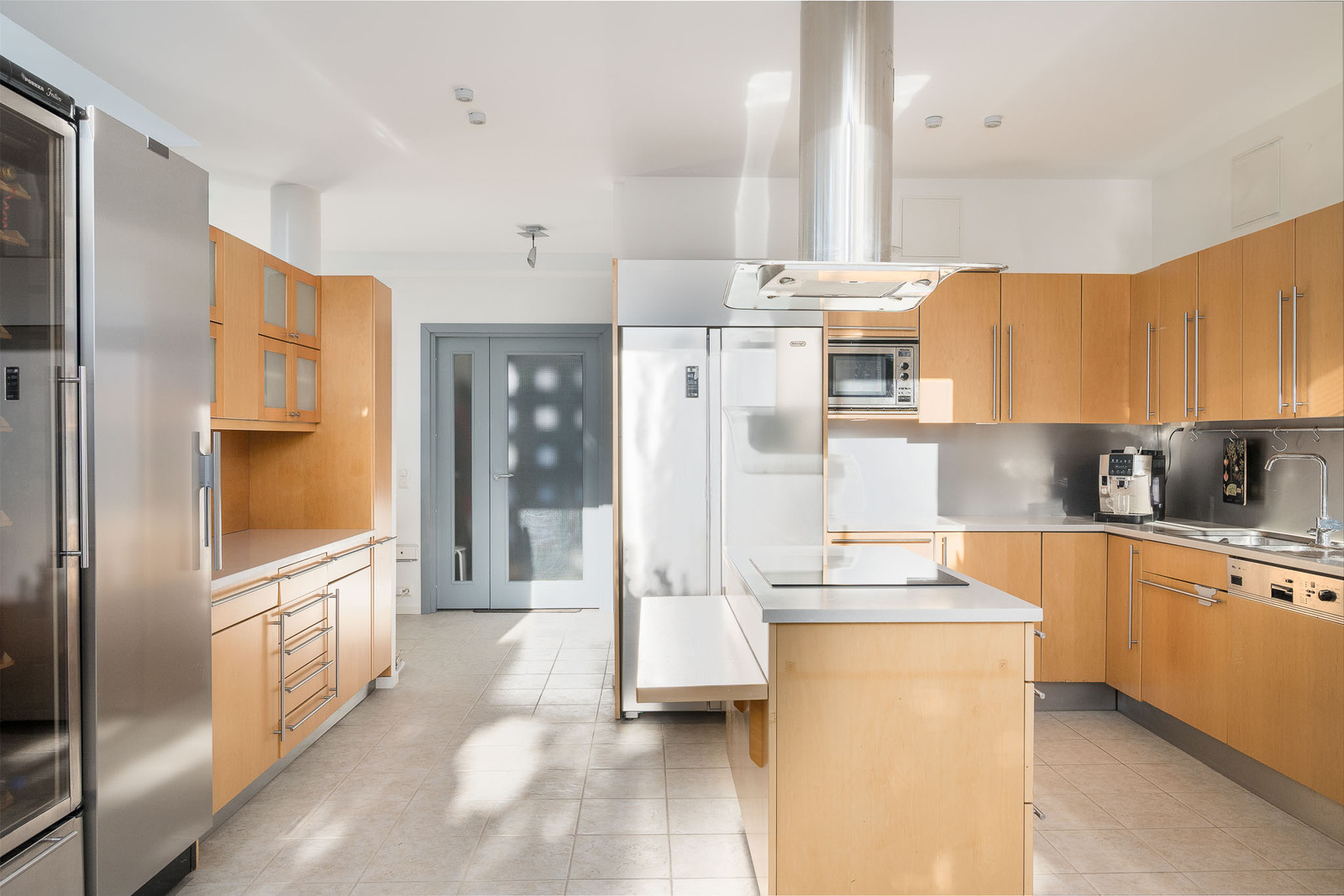 Avesia-keittiö, jossa vaaleat kivitasot. Keittiössä on Festivon täyskorkeat kylmiö sekä viinikaappi, DeLonghin side-by-side jääkaappi/pakastin, Bosch induktioliesi, liesituuletin, Samsungin itsepuhdistuva uuni, Mielen astianpesukone ja mikro. Keittiön lattia on italialaista kivilaattaa ja seinät maalattu. Keittiön yhteydessä ruokailutila, jossa hulppea yli kuuden metrin huonekorkeus sekä käynti pienemmälle lasitetulle terassille. |