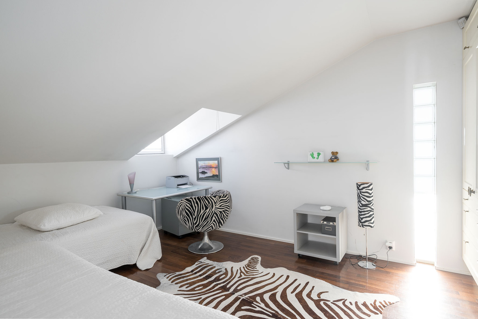 Yläkerrassa kaksi makuuhuonetta. Päämakuuhuoneessa kiinteä matala päätykaappi, pieni parveke, ilmalämpöpumppu sekä käynti kylpyhuoneeseen. Toisessa huoneessa on korkea kaapisto ja kattoikkuna. Yläkerrassa on myös aula, jossa kaapisto ja käynti molempiin makuuhuoneisiin sekä kylpyhuoneeseen. Aulan parvekkeelta aukeaa näkymä alakertaan, olohuoneeseen. Lattiat on parkettia ja seinät maalattu. |
